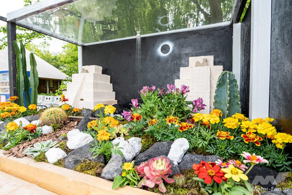 植物は色とりどりのお花に加えてサボテンを使用。さらに部分的に雨を降らせつつ、ピラミッドを置くなどインパクトの強い庭園となった作品。コンセプトは「メキシコ」とのことで、「この庭を見て少しでもメキシコについて知ってみたいと思っていただければ」。