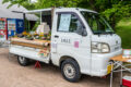 荷台下にパネルを貼って、庭園の見た目を引き立てる。ハイゼットのブルーの純正色もヨーロッパ風の雰囲気を引き立てている。
