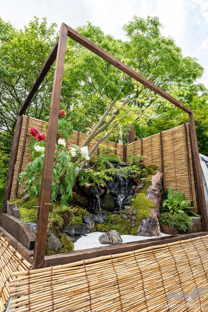 伝統的な庭園デザインと現代的なLED装飾を融合させた福樹園さんの荷台庭園。庭木ではなく山木を仕様することで、深い山と河のせせらぎを表現した日本庭園に仕上げた。竹の壁面を作成し、背の低い植物から背の高い植物へと目線を誘導する作りは見事の一言。