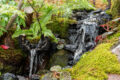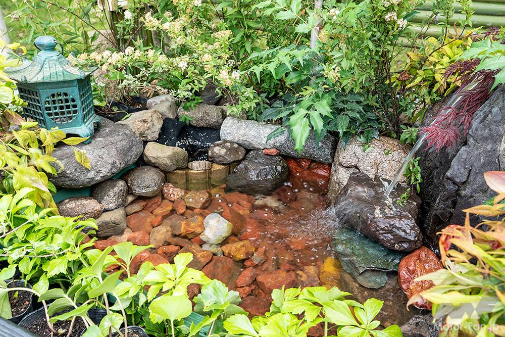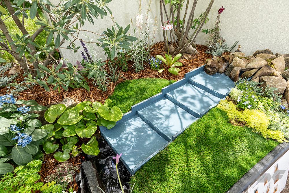 庭園中央を流れるカスケードは、見方によっては小川のようにも見える。それを囲むように配された植物達。「人工物と柔和な自然との調和・バランス感を大事にしました」とは飯山造園さん。造園業界のPRにも一役買う、見事な庭園作りを見せている。