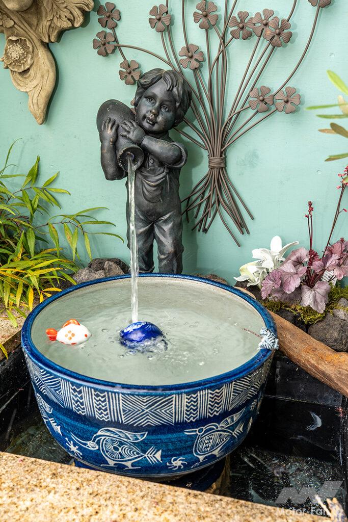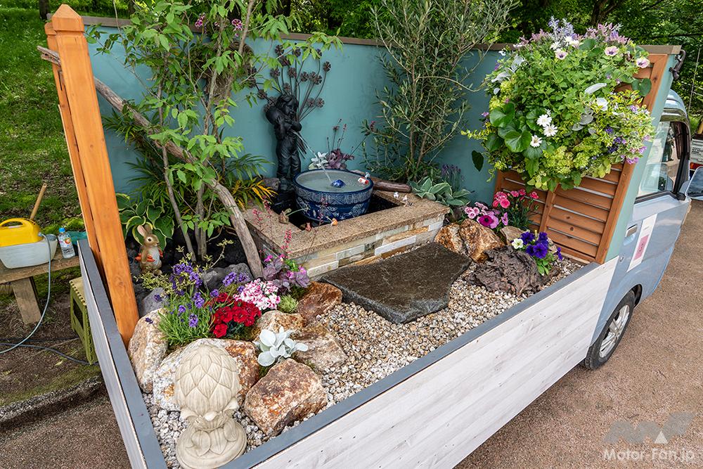 イメージはヨーロッパのパティオ(中庭)。荷台の中央に噴水を配し、周囲を石や植物であしらった。また、助手席側に壁を設置し、見る向きを限定しているのもひと工夫。軽トラックの荷台だけでなく、自宅の庭にも欲しいと思わせる庭園と言って良いだろう。