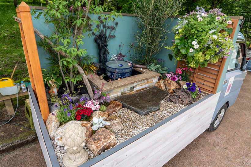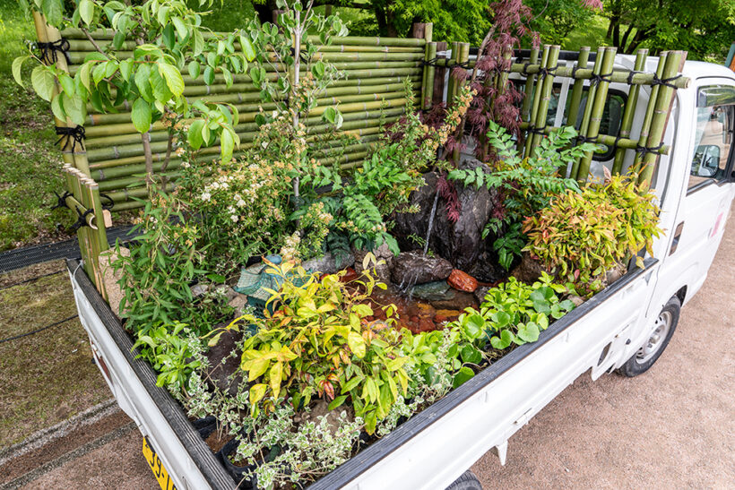 ユーザーカー 【軽トラ庭園】コレがカスタマイズの新しい形!? 涼しげな本格庭園が軽トラの荷台に出現!〘中編〙【写真・15枚目】 S200 HIJET高田造園土木さんベース車両はダイハツのハイゼット。高々と組み上げたフレームに負けない荷台の植物がインパクト十分の情景を作り出す。 S200 HIJET 高岡庭園さん 軽トラックの荷台を平面ではなく立体的に使った構図が見事。生い茂った植物と滝を中心とした渓流で、まさに山の情景を再現。 大ぶりの石をうまく使い滝を表現。流れる水が清涼感を感じさせる。まさに「渓流のひとこま」といった風情を感じさせる。 中央にカスケードを使った庭園作りは、どこかジブリ作品のような印象も与える。外周に向かって植物を高くしているのもグッド。 TT2 SAMBAR 飯山造園さん荷台に背景枠としてのボックスを作ってしまった飯山造園さん。ひとつの世界観を荷台スペースで完成させている。 大きな瓶に竹を組み合わせて手水舎のようなあしらいとした。隣の石柱にはLEDが仕込まれており、キラキラとした輝きを見せる。 DA16T CLIPPER 中山福樹園さん 一口に「植物の緑」と言っても、黄色っぽいものから深いグリーンまで色味は様々。それが、庭園の表情をさらに豊かにしている。 荷台前方に配置された池。水が注がれる音と水面のきらめきが心を癒やしてくれる。池の端には灯籠も置かれておりとってもオシャレ。 HA8 ACTY北野造園さんベース車はHA8アクティトラック。荷台の庭園以外は純正のままエントリーだ。フロントからの見た目とリアとギャップが凄い。 中央の噴水を囲むように、その他の要素を配置。助手席側に向かって高くしていくことで、表情に富んだ庭園を造り出している。 こちらが荷台中央に置かれた噴水。子どもが瓶を持つ彫像が、ヨーロッパ風のオシャレ感を引き立たせる。水の扱い方も見事だ。 S500 HIJET飯山造園さん荷台下にパネルを貼って、庭園の見た目を引き立てる。ハイゼットのブルーの純正色もヨーロッパ風の雰囲気を引き立てている。 この画像の記事を読む