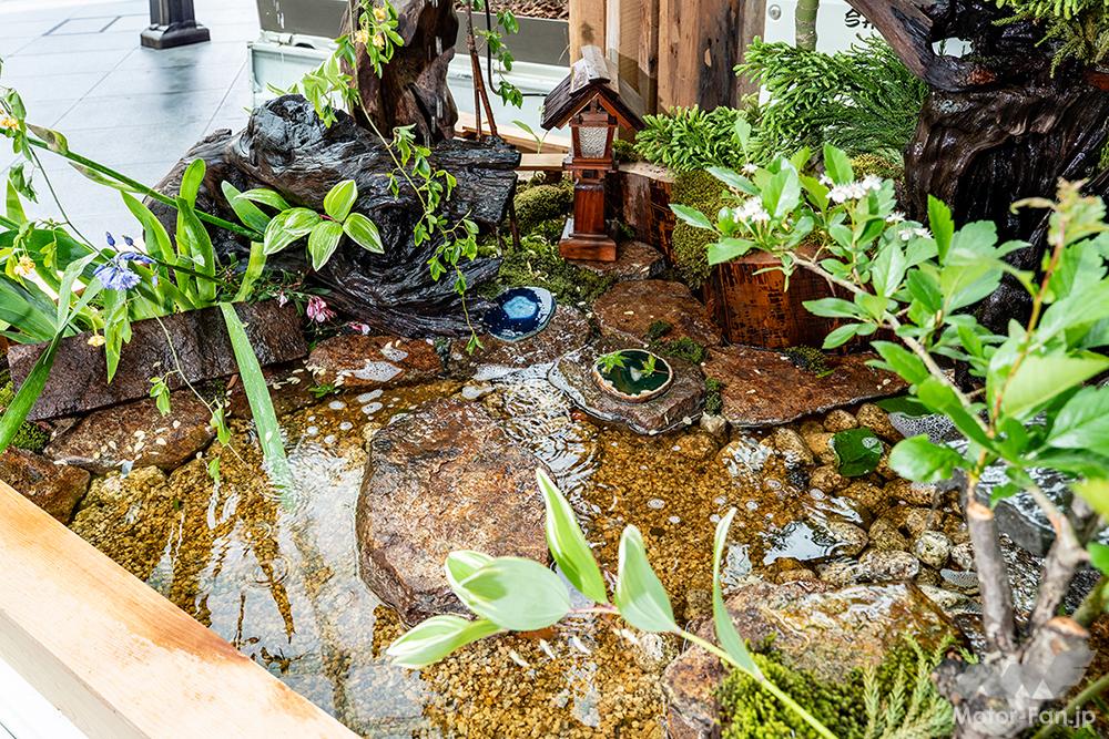 早くて簡単に作れる庭を、というのが制作時のコンセプト。助手席側に大胆に岩を配し、運転席側との高低差で立体的に見せる。なお、植物はポイント的に使用し、あえて茂らせていない。この時短コンセプトは自宅の庭を造る際にも、ぜひ取り入れたいところ。