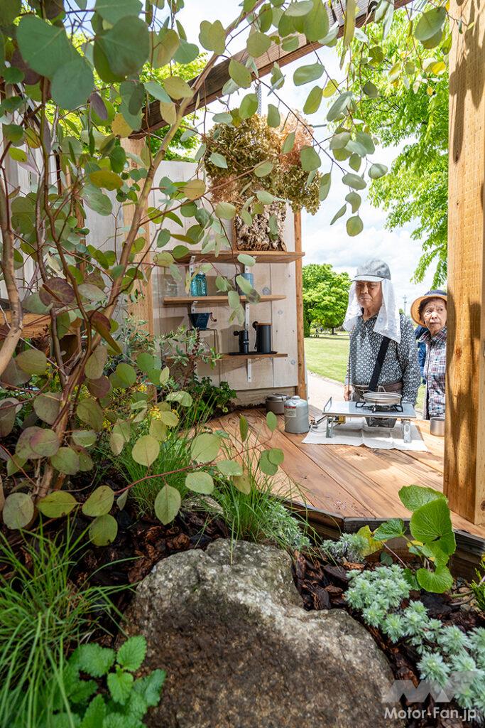 軽トラックの荷台に素敵なガーデンキッチンを作ってしまったのはTKKさん。荷台の広い範囲をウッドのテーブルとし、その周囲に植物を配した。しかも植物の中には食べられるものまで取り入れている。こんなガーデンキッチンがあったら、家族での食事も楽しそう。