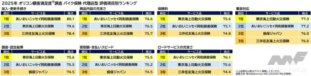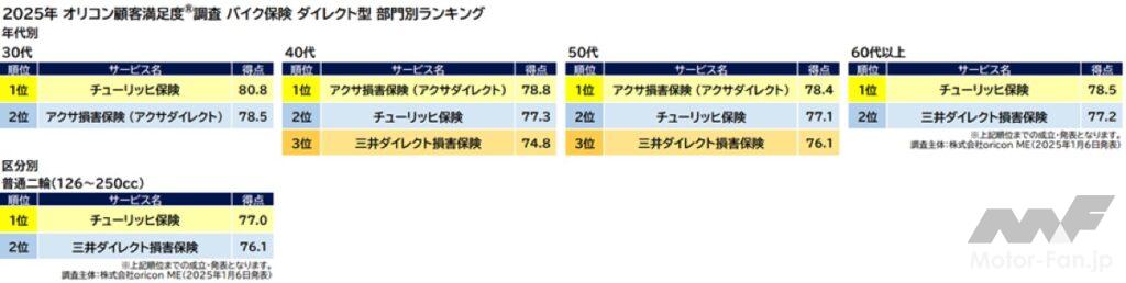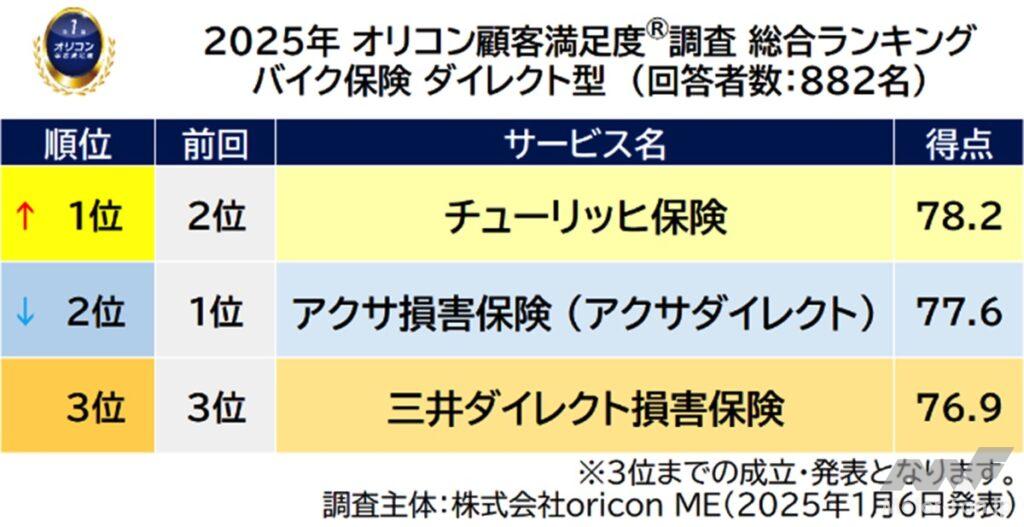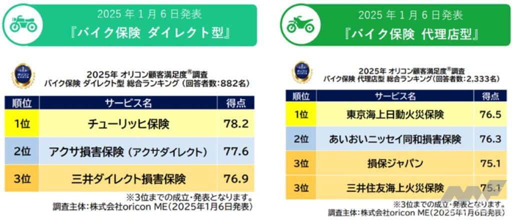 チューリッヒと東京海上が首位獲得、オリコン顧客満足度「バイク保険」調査