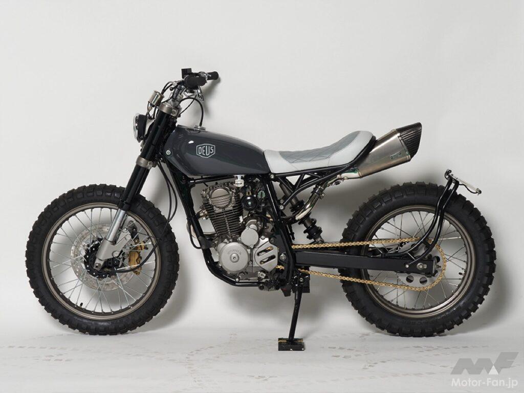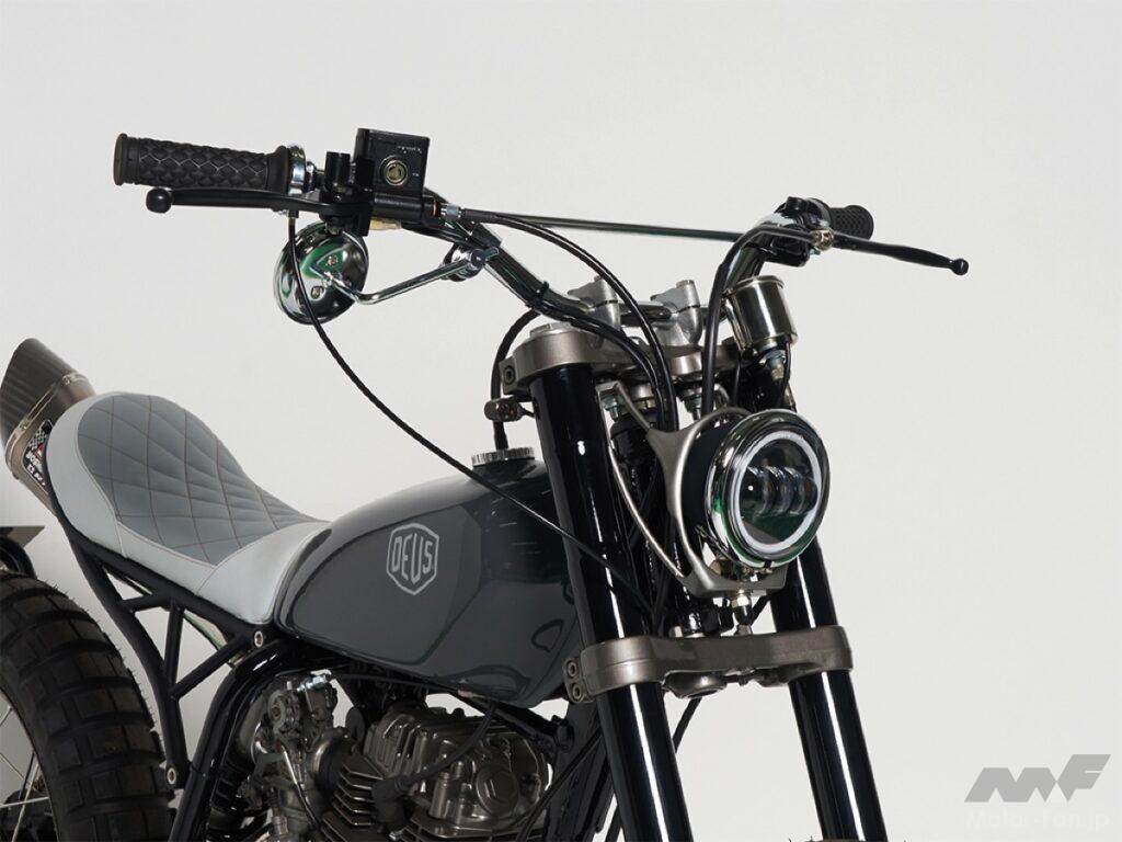 SKOLLと名付けられたカスタムバイクが、Deus Ex Machina Japan(以下、デウスジャパン)によって生み出された。倒立フロントフォークと19インチのフロントタイヤが引き締まったアグレッシブなスタンスを描き出し、ストリートにおいて異彩を放つ一台だ。燃料タンクにはホンダ・エルシノアMT250用のタンクをショート化し、リアフレームも大胆にカット、さらにヨシムラ製サイレンサーを装着することで、力強さと存在感、そしてノスタルジックな魅力が同居する“走る相棒”としての個性が際立つ。