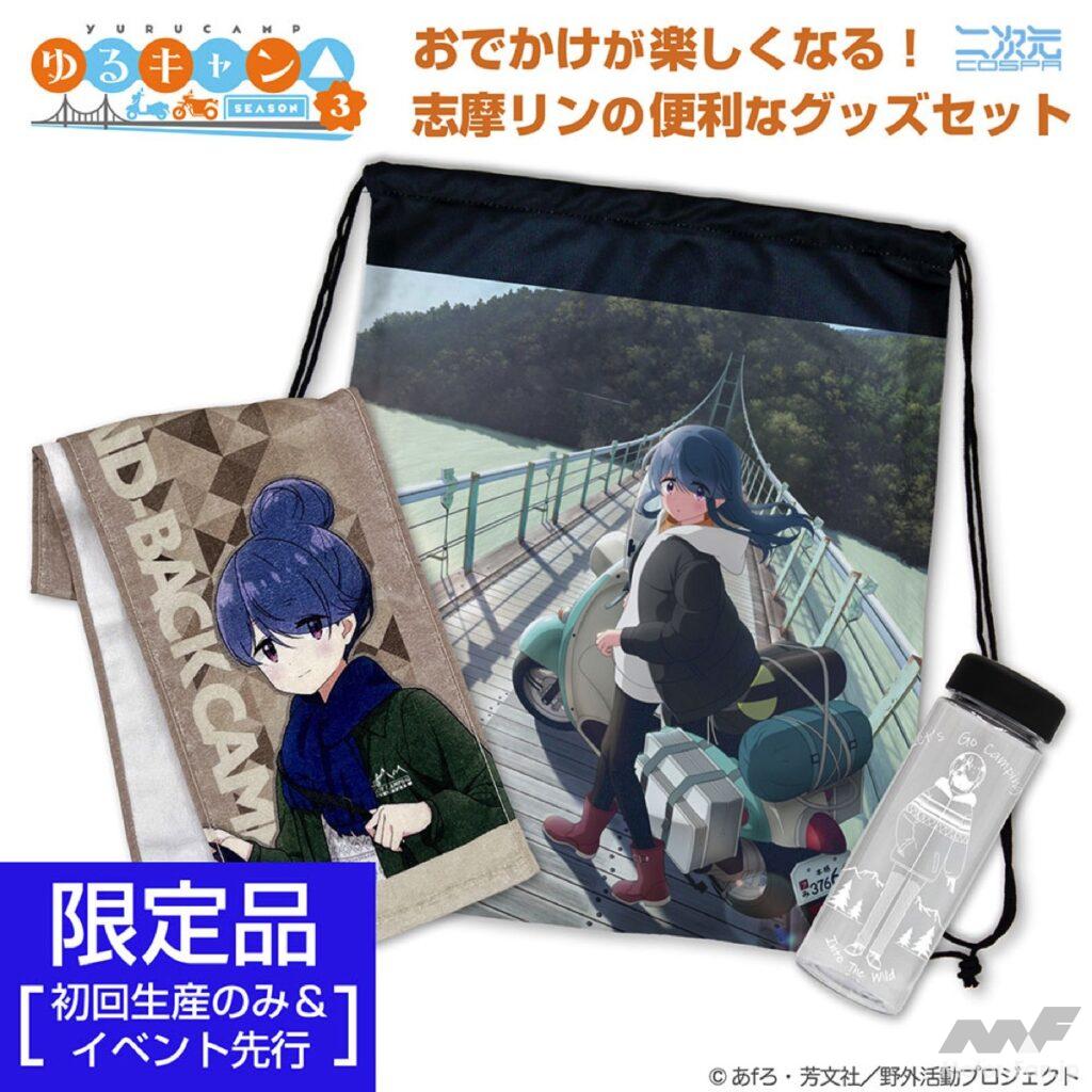 『ゆるキャン△ SEASON3』の新グッズ「志摩リン おでかけセット」が初回生産限定で登場する。クリアボトル、マフラータオル、ナップサックの3点が揃い、11月中旬発売予定、価格は税込5,000円。ナップサックは両面プリントのメッシュ素材でA4対応、巾着式開閉が可能。マフラータオルはアウトドアシーンにも適したコットン素材、クリアボトルは500ml容量でストッパー付きの着脱設計となっている。いずれもコミケ106(8月16〜17日)や山梨・静岡のモデル地イベントで先行販売され、予約は9月7日まで受け付けられる予定になっている。