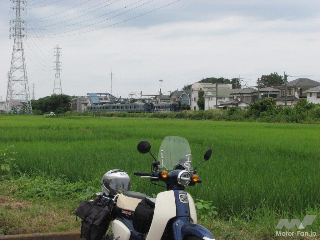本来なら橋本駅から線路伝いに南下していくべきだったのかもしれないが、僕にはとくにこだわりはないので、上溝辺りからなるべく線路に近い道を選んで走った。住宅街に迷い込んだり、行き止まりだったり、畦道を走ったりとなかなか鬱陶しい行程になってしまったのだが、スーパーカブの機動性がフルに発揮できてなによりだった。運行本数は日中の時間帯上下3本ずつ。単純計算で10分に1本の電車が撮れるから、夏日の暑さに耐えながら3ケ所のポイントで撮影してみた。