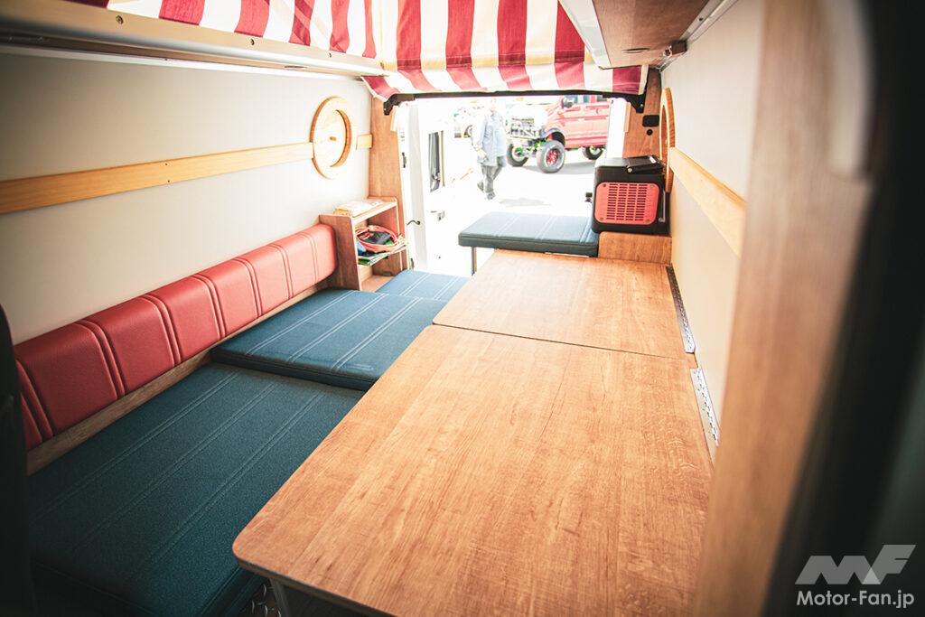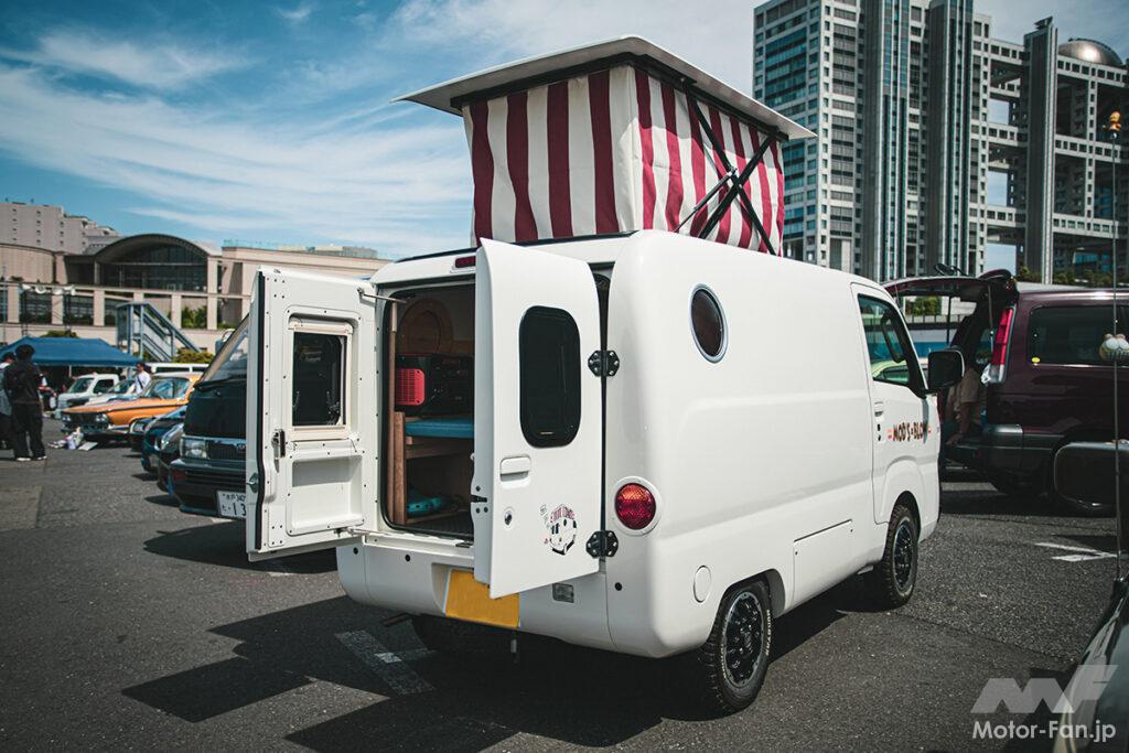 昨今、リッタークラスではトヨタタウンエースやプロボックス、日産NV200などのバンタイプをベースにしたカスタムが流行りを見せるが、Blowではさらにディープにハイゼットトラックをベースにバン化するシェルキットを製作。顔面もUSパネルバンとして人気のエコノライン風にイメチェンすることで、エッジの効いた現行マスクとは一線を画す、オールドテイストな丸目を採用。旧車好きだけでなく女性ユーザーの支持も獲得した。また、トラックベースの荷台をシェル化したことでワゴンタイプより広さを確保している点も見逃せない。