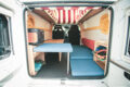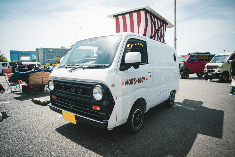 昨今、リッタークラスではトヨタタウンエースやプロボックス、日産NV200などのバンタイプをベースにしたカスタムが流行りを見せるが、Blowではさらにディープにハイゼットトラックをベースにバン化するシェルキットを製作。顔面もUSパネルバンとして人気のエコノライン風にイメチェンすることで、エッジの効いた現行マスクとは一線を画す、オールドテイストな丸目を採用。旧車好きだけでなく女性ユーザーの支持も獲得した。また、トラックベースの荷台をシェル化したことでワゴンタイプより広さを確保している点も見逃せない。