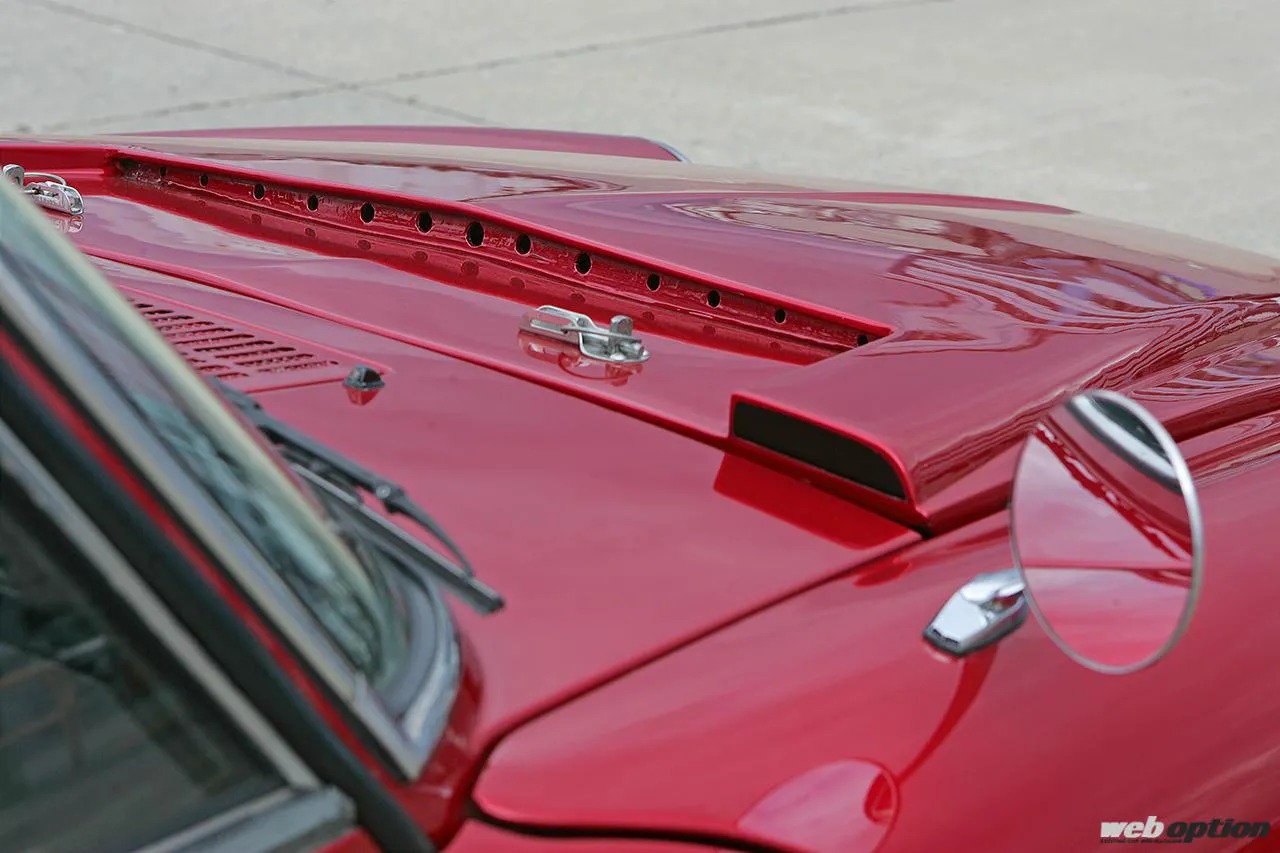 エクステリアは可能な限りオリジナルをキープする方向性だが、ボンネットだけはスペース確保と熱対策のためにリメイクされている。
