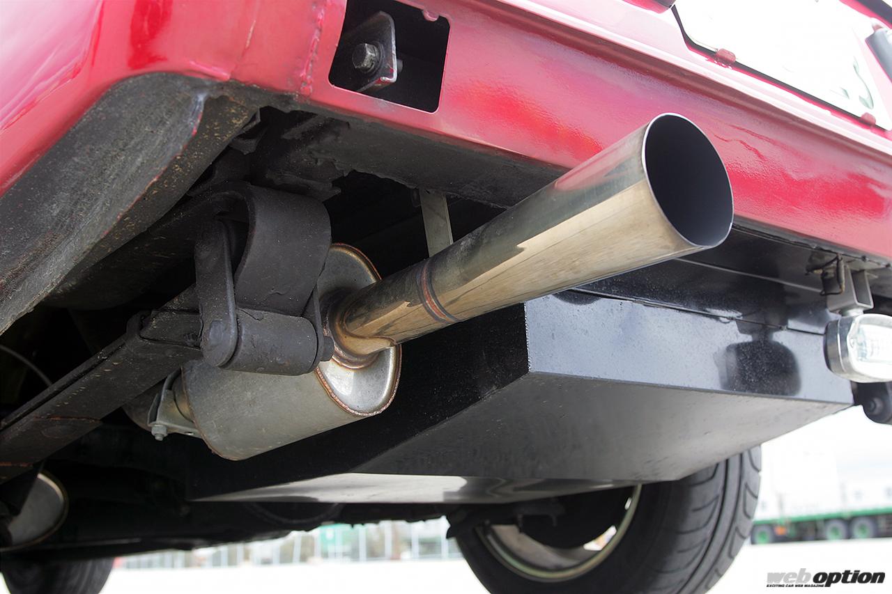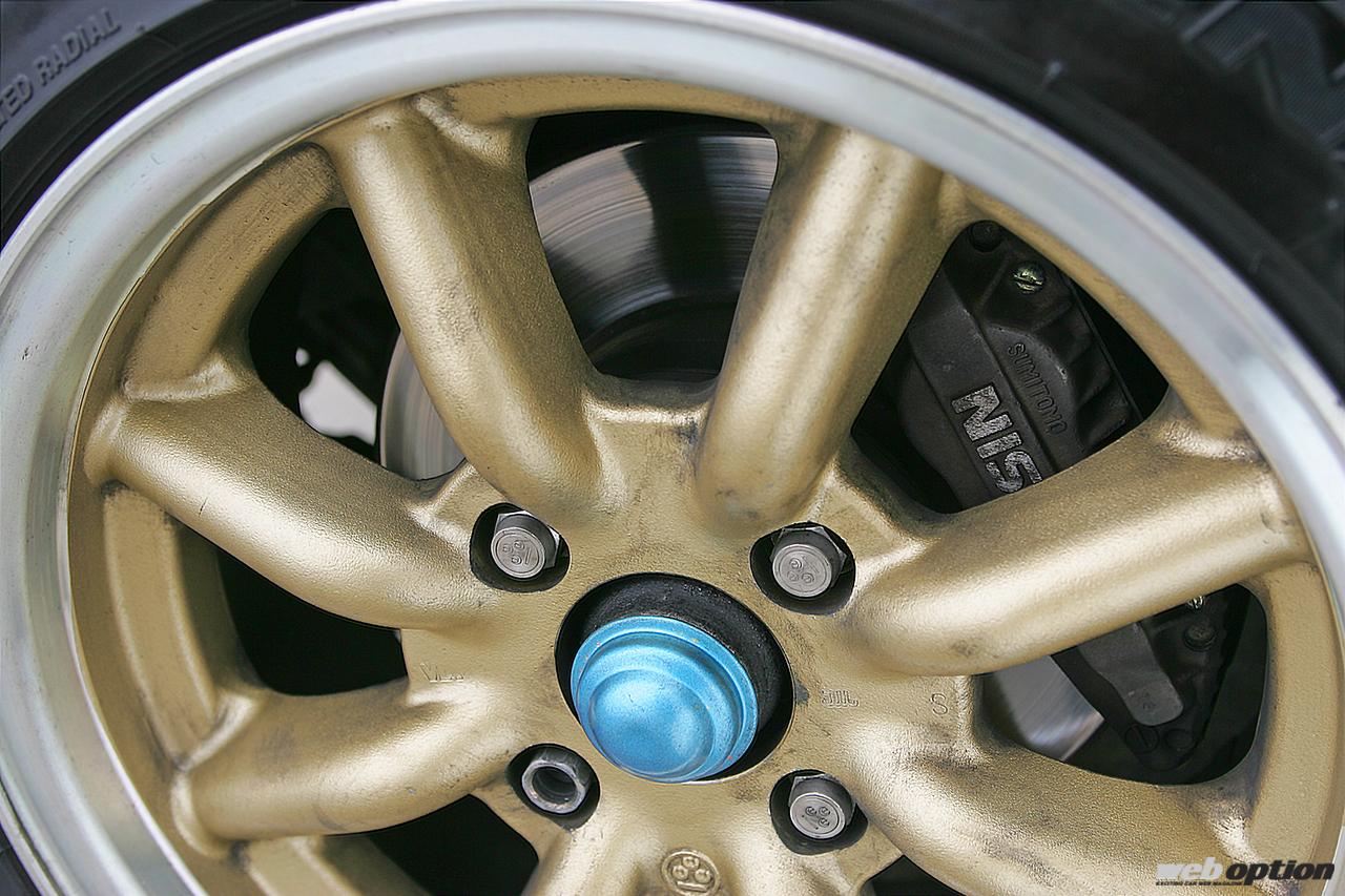ブレーキはZ32キャリパーを前後に流用してストッピングパワーを強化。ちなみにローターは15インチホイールが履けるように小径化が行われている。