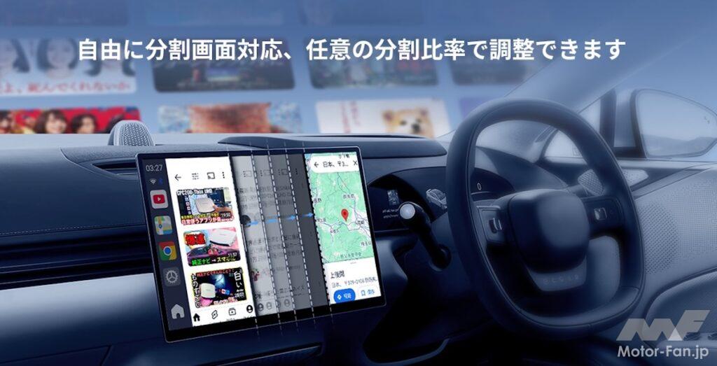 ワイヤレス接続のApple CarPlayやAndroid Autoに対応した本機は、純正モニターにUSB接続するだけで、ナビ、通話、動画配信、音楽再生などが可能とする。動画アプリがプレインストールされており、車内でも動画などを快適に楽しむことができる。画面表示はナビと映像を同時に表示することもでき、任意の比率で自由に分割が可能だ。