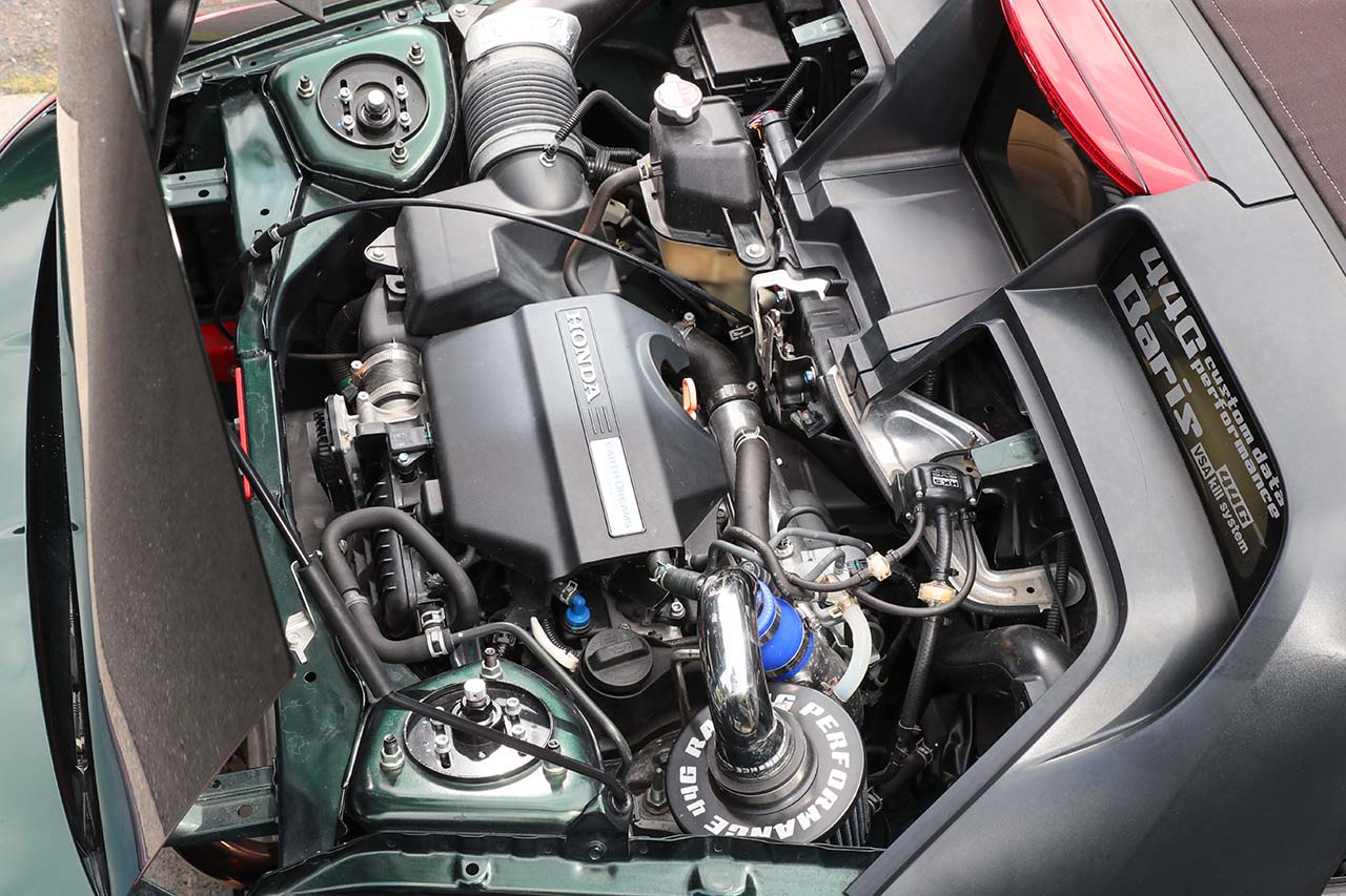 HKSブーストコントローラー「EVC」で立ち上がりを鋭くし、高回転のタレも抑制。専用インタークーラーは放熱塗装済みで吸気温度を低下させ、安定したパワーを実現。