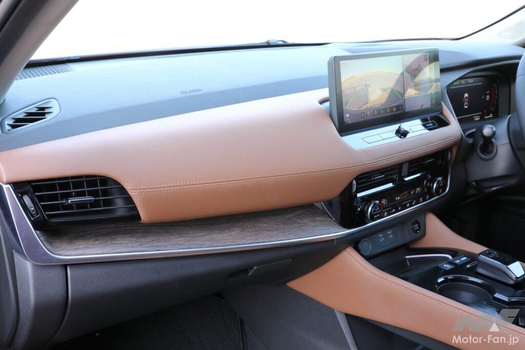 インテリアは、洗練という現行エクストレイルから採用されたファクターをグレードアップした印象だ。インパネやドアトリムはブラックとなり、シート地はジャパニーズモダンを意識したものになった。オプションのナッパレザーは、従来のタン色からチェスナットブラウンとなり、より上質な雰囲気を高めている。