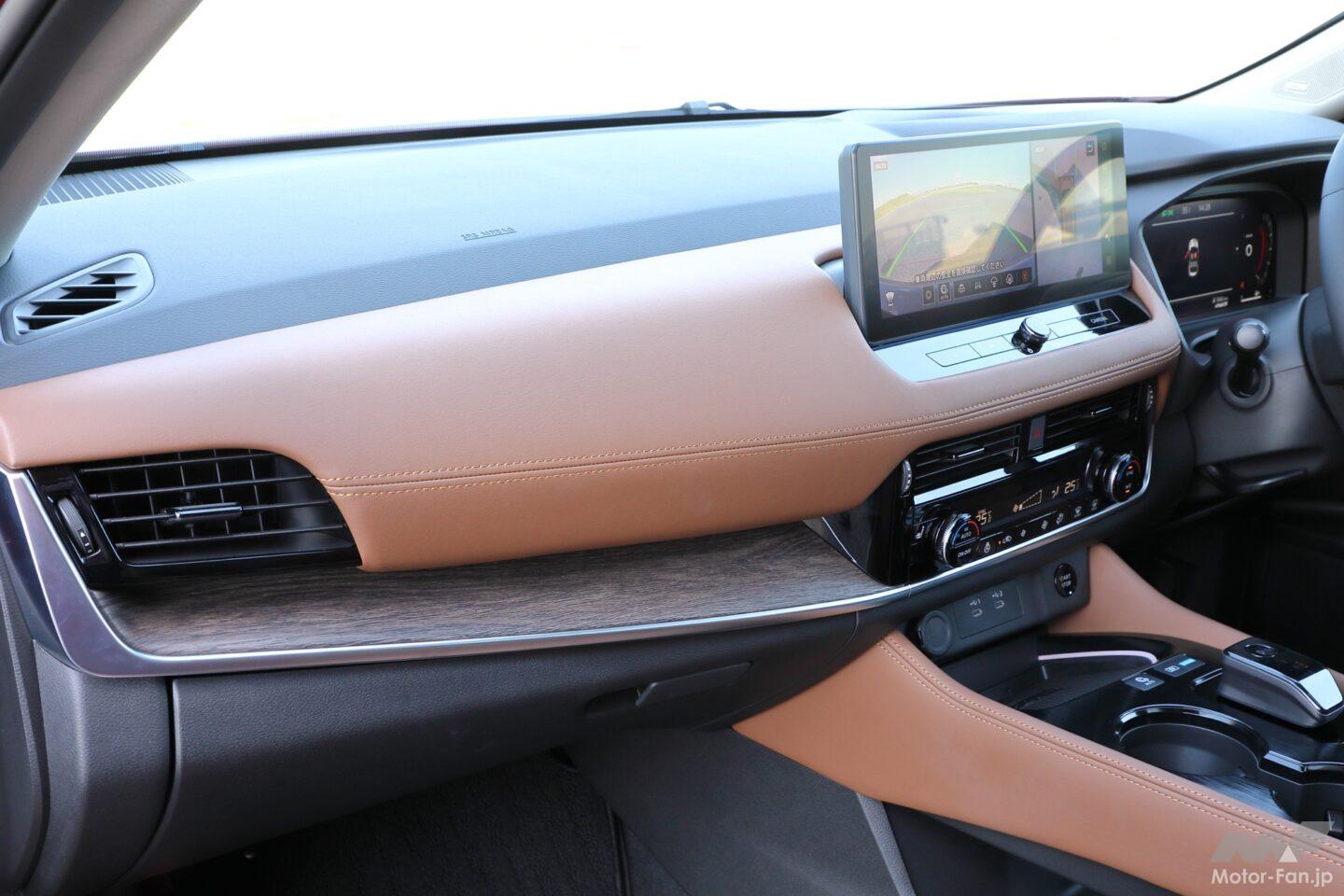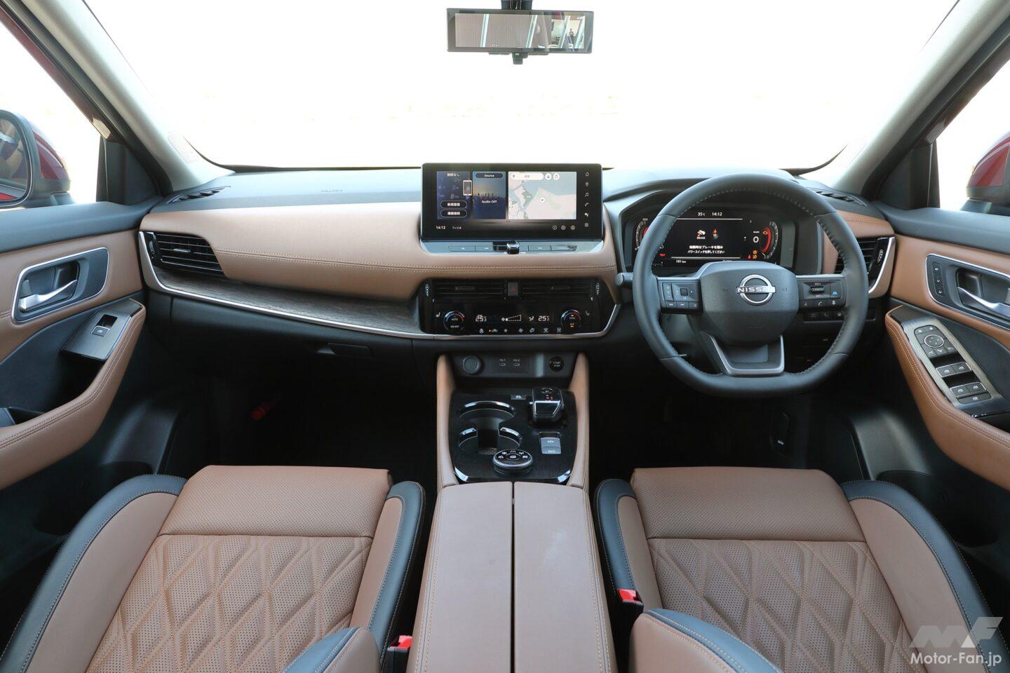 インテリアは、洗練という現行エクストレイルから採用されたファクターをグレードアップした印象だ。インパネやドアトリムはブラックとなり、シート地はジャパニーズモダンを意識したものになった。オプションのナッパレザーは、従来のタン色からチェスナットブラウンとなり、より上質な雰囲気を高めている。