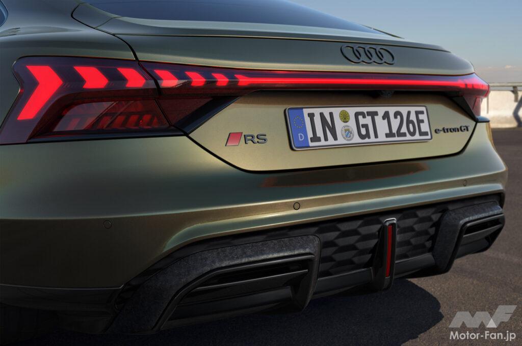 リヤエンドは、美しいプロポーションとエアロダイナミクスを両立させた格納式リヤスポイラーと、水平基調のリヤコンビネーションライトにより構成され、夜間でもひと目でアウディとわかるシグネチャーデザインとなっている。垂直フィンを備えたエレガントなデザインの空力ディフューザーも特徴的で、上部にボディ同色のインレイを備え、ラグジュアリーな質感を視覚的にも主張する。「RS e-tron GTパフォーマンス」には、モータースポーツからのフィードバックを反映した流線型のディフューザーを採用。フロントと呼応する立体的なL字型ブレードや、エアロチャネルの間に配された垂直の赤いリフレクターなど、機能性とデザイン性を兼ね備えたディテールが、「RSパフォーマンス」モデルとしてのスポーティなキャラクターを強調している。