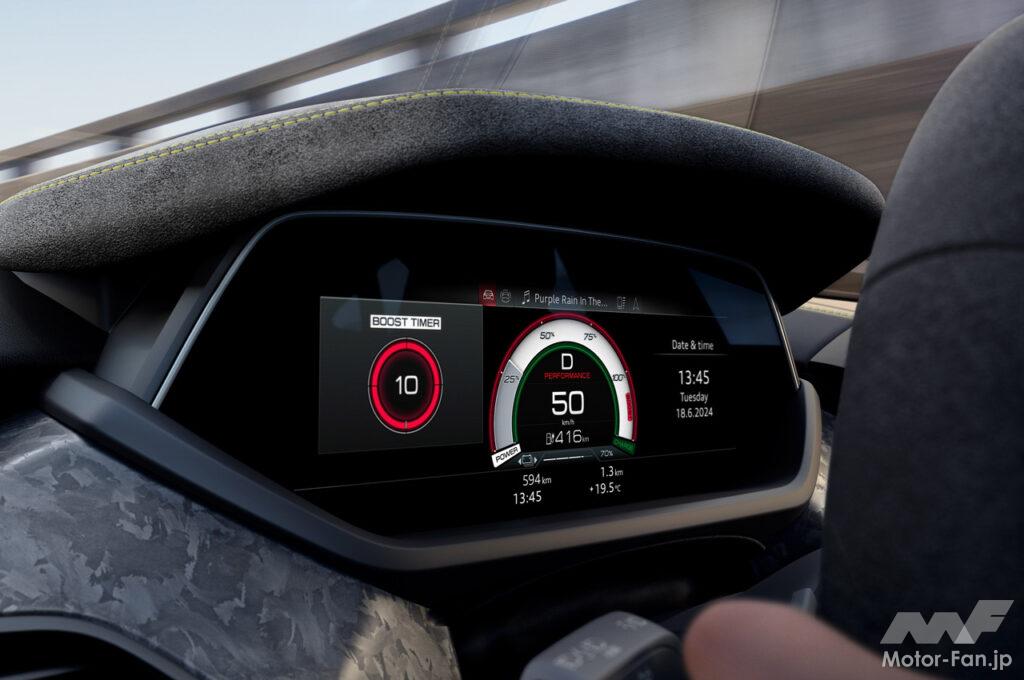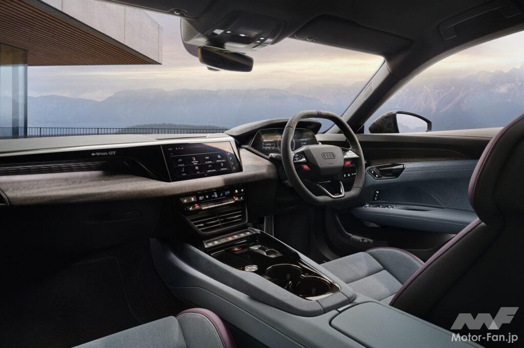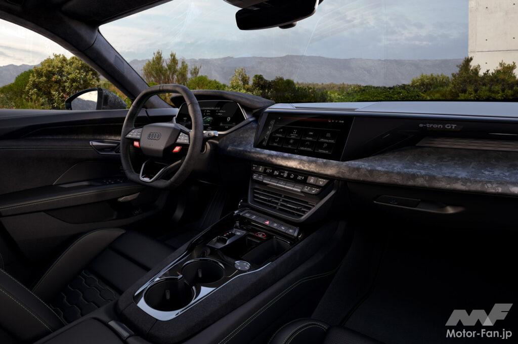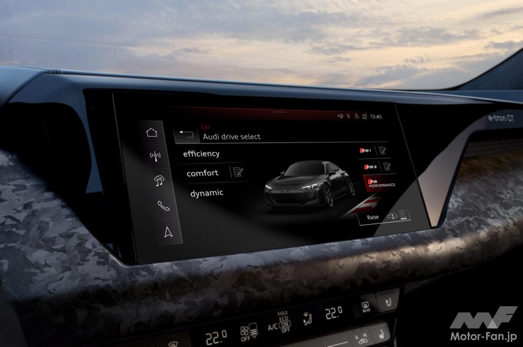 インパネには10.1インチのタッチスクリーンを備え、MMIナビゲーションシステムによるさまざまな機能をシンプルな操作で行える。メーターパネルには、高解像度の12.3インチの液晶パネルを採用し、アウディバーチャルコックピットプラスを搭載。新たにバッテリー温度、急速充電予測、プレコンディショニング状態など、HV(高電圧)バッテリーに関する情報を提供し、充電可能な最大出力をリアルタイムで表示する。「RS e-tron GTパフォーマンス」には、RS専用コンテンツを表示するディスプレイが装備されており、例えば、MMI経由でホワイトのパワーディスプレイとスピードメーターを選択することができる。