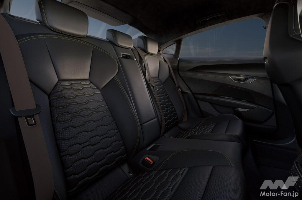 「RS e-tron GTパフォーマンス」には、ディープブラックのダイナミカ、バナジウムルックのデコラティブエレメンツを採用。天然繊維のようなファブリックのカスケードは、15%のセルビッチと35%のリサイクルされたポリエステルで作られており、環境保護の観点から染色はされておらず、シートやドアトリムに用いらされている。カーペットおよびフロアマットは、Econyl(エコニール)製で、生産廃棄物、ファブリックやカーペットの残布、古い漁網などから100%リサイクルされたナイロン繊維素材だ。