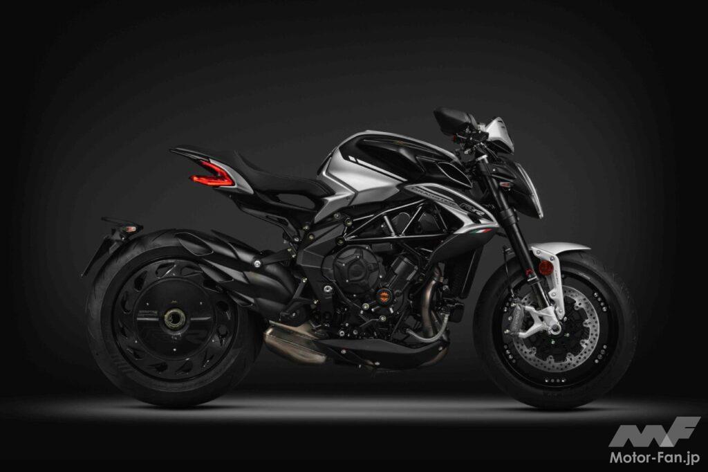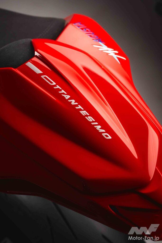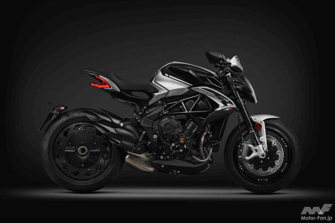 ハイパフォーマンスのネイキッドモデルブルターレシリーズの中でも最もスポーティなブルターレRR。記念モデルは鮮やかなレッドのロッソアゴと落ち着いたシルバーのアルジェントアゴの専用カラーリングを採用し、ヘリテイジロゴが施されている。また、トルクアシスト機能を備えた新型の9枚ディスクスリッパークラッチも搭載されている。