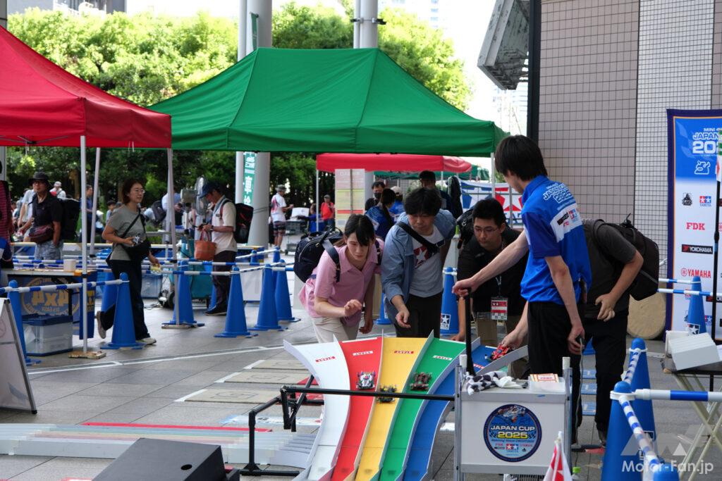今回の取材では、品川シーサイドフォレストで開催された「ジャパンカップ 東京大会1」の会場を訪れた。7月26~27日の二日間にわたって開催され、合計1757名が参加したという。ここでは主に初心者向けカテゴリーである「トライアルクラス」の様子をじっくりと見学。あまりスピードの出ないモーターのみ搭載可能なクラスだが、それでも多くのマシンがコースアウトや転倒、トラブルによってレース半ばでリタイアしていたのが印象的だ。