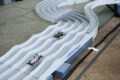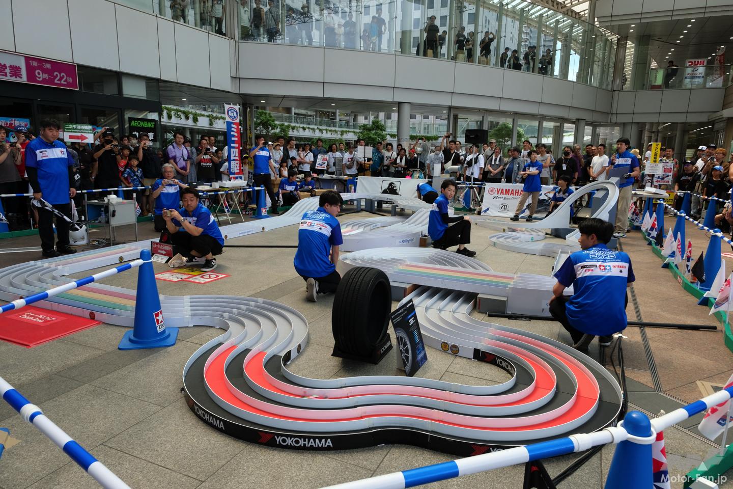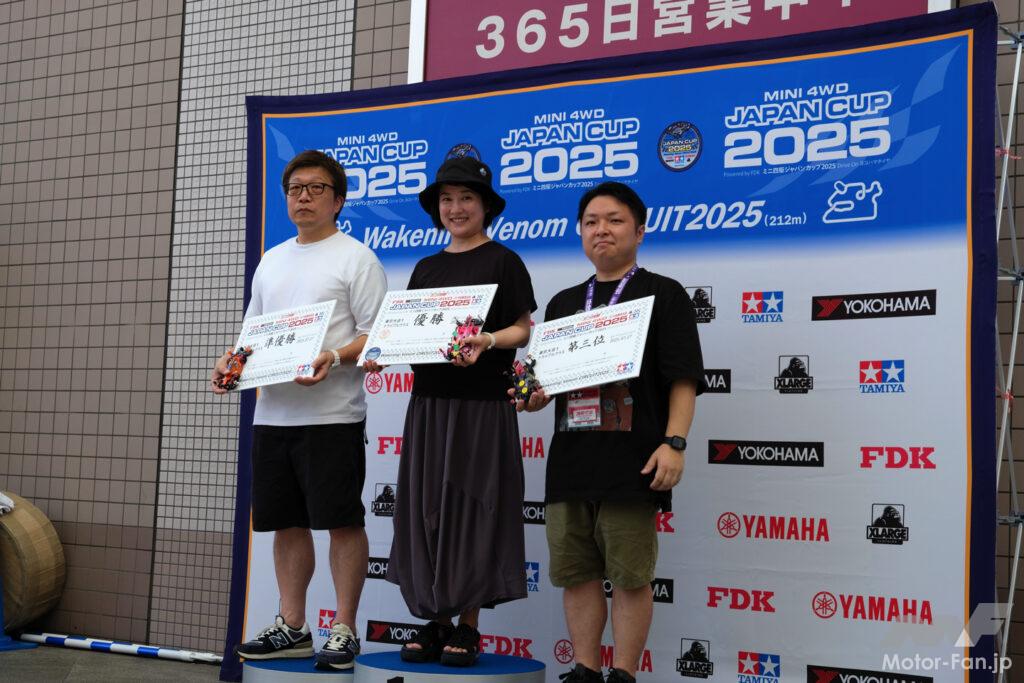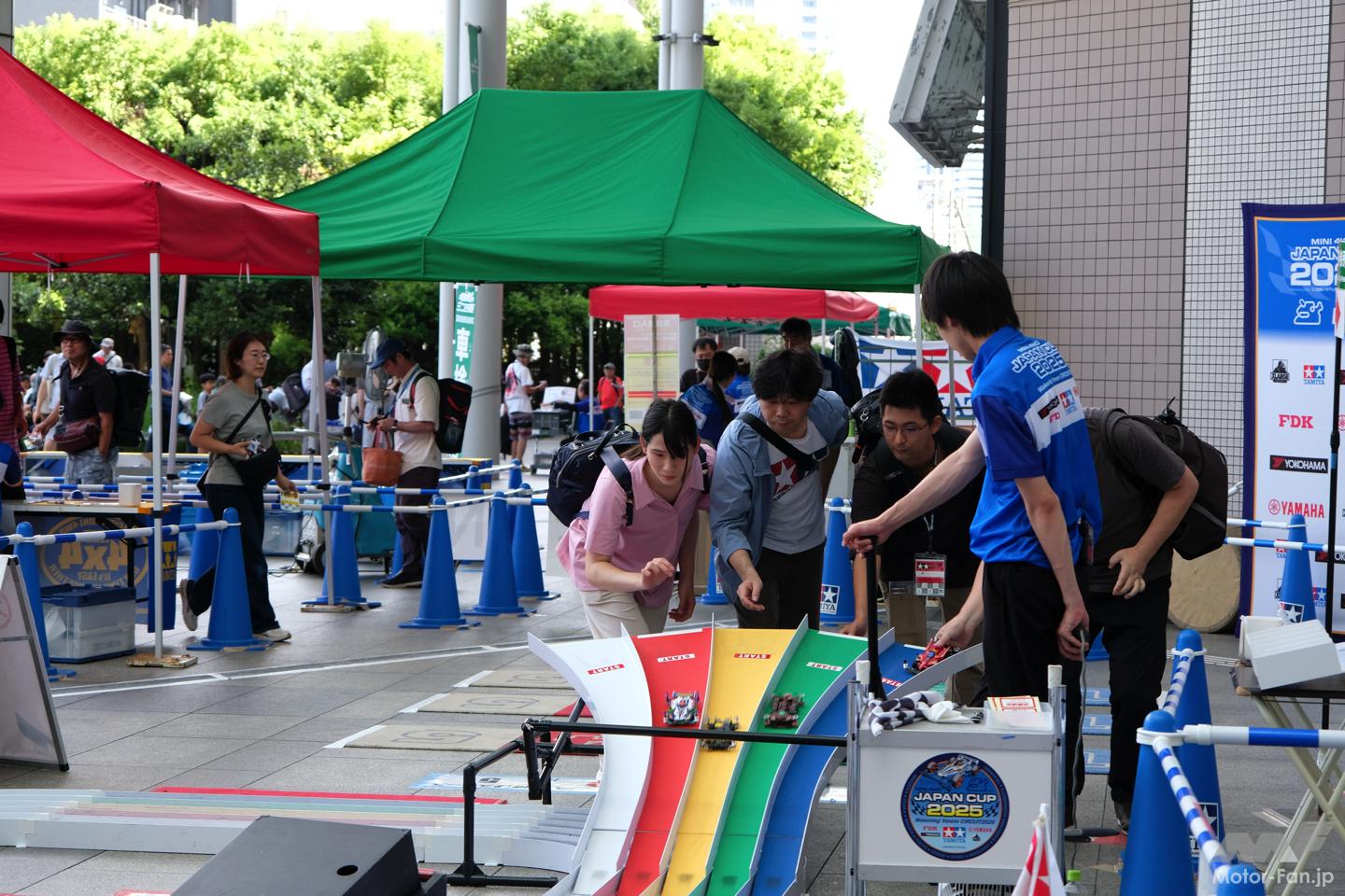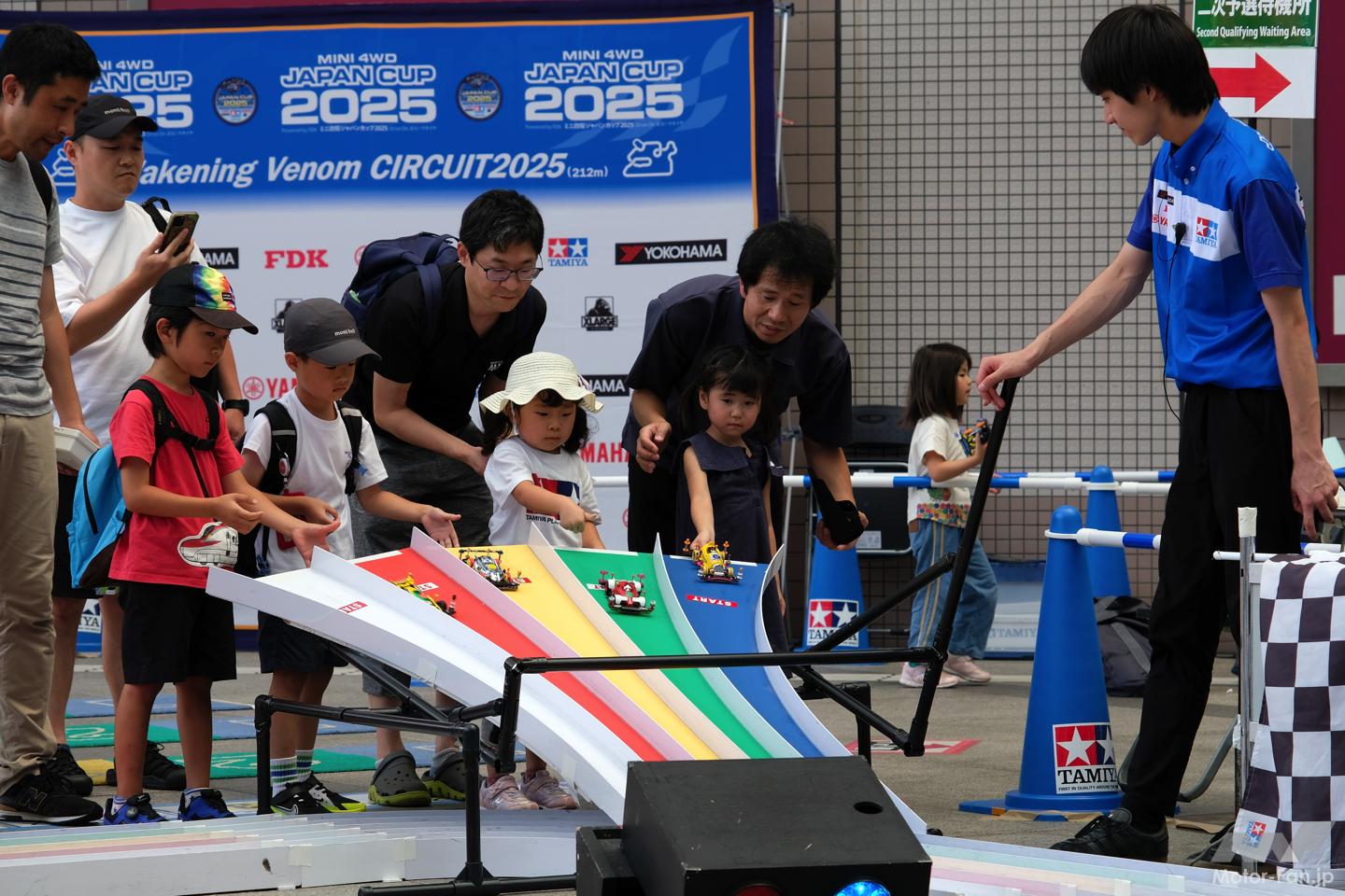 全国11会場16大会で行われる「ミニ四駆ジャパンカップ2025」(以下ジャパンカップ2025)は、ミニ四駆レーサーにとっての夏の甲子園。日本一決定戦である。5レーンのコースは、周回ごとに走行レーンが変わるようになっており、計5周して勝敗を競う。全長約212メートルの巨大なコースは、急カーブ、ジャンプスポット、急スロープといった立体的なセクションが間断なく組み合わさったもの。走行レーンごとにコーナーの曲率も変わるため、1周、2周と調子よく周回を重ねたマシンが最終周であえなくコースアウトしてしまうこともある。