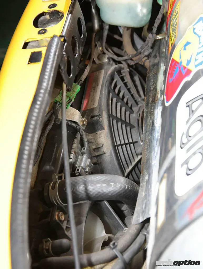 ラジエターはフロントフード内のスペアタイヤスペースに搭載。フロントには導風グリルが備わっていないため、電動ファンでラジエターにフレッシュエアを導くように改良。真夏の環境でもオーバーヒートの心配はないそうだ。