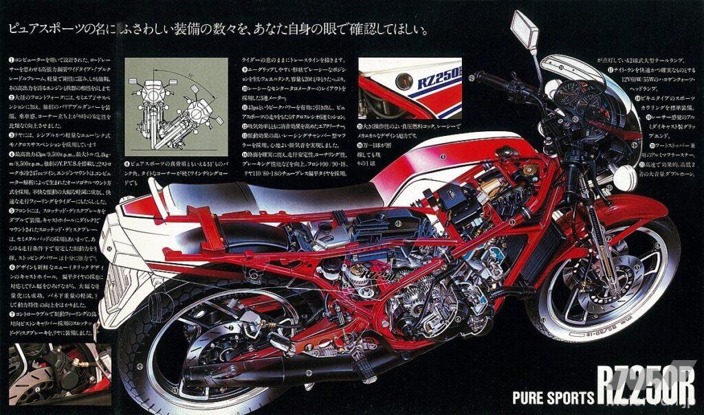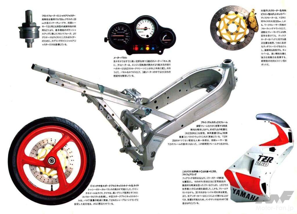 そして前任のRDとは異なる初代RZの特徴は、市販レーサーTZ譲りの水冷機構やモノクロス式リアサスペンション、ヘッドパイプとスイングアームを直線的に結ぶフレーム、火炎をイメージしたキャストホイールなどで、RZ-Rとは似て非なる路線に進んだ初代TZRのセールスポイントは、GPレーサーYZR500が規範のアルミ製デルタボックスフレーム、前後17インチの中空3本スポークホイール、吸気形式をピストンリードバルブ→クランクケースリードバルブに改めたエンジンなど。言うまでもなく、それらは当時としては画期的な装備だった。