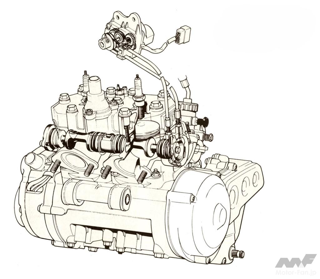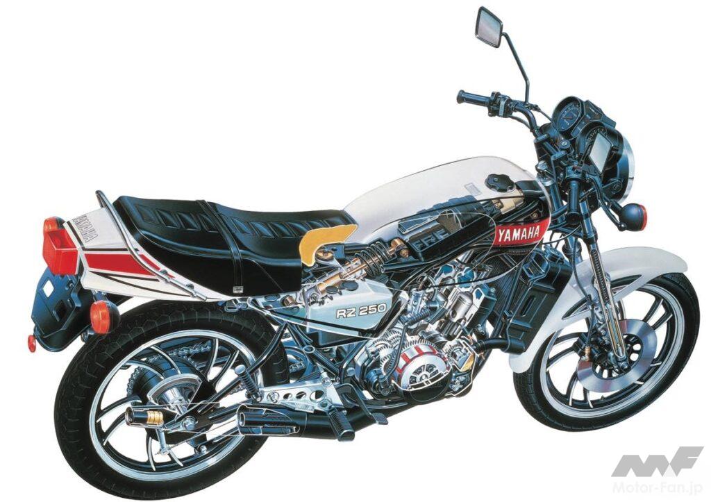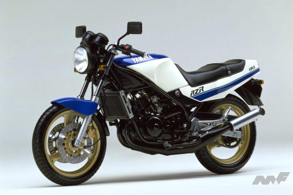 そして前任のRDとは異なる初代RZの特徴は、市販レーサーTZ譲りの水冷機構やモノクロス式リアサスペンション、ヘッドパイプとスイングアームを直線的に結ぶフレーム、火炎をイメージしたキャストホイールなどで、RZ-Rとは似て非なる路線に進んだ初代TZRのセールスポイントは、GPレーサーYZR500が規範のアルミ製デルタボックスフレーム、前後17インチの中空3本スポークホイール、吸気形式をピストンリードバルブ→クランクケースリードバルブに改めたエンジンなど。言うまでもなく、それらは当時としては画期的な装備だった。