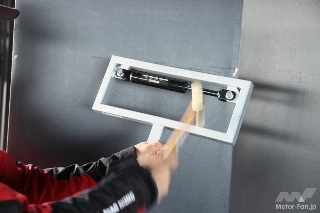 上はパフォーマンスダンパーの効果をわかりやすく体験するためのキットで、金属の枠を叩いた際の振動の違いを感じることができる。なるほど、パフォーマンスダンパーを装着すると、その振動収束のスピードが段違いであることがはっきりとわかった。