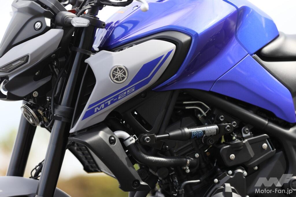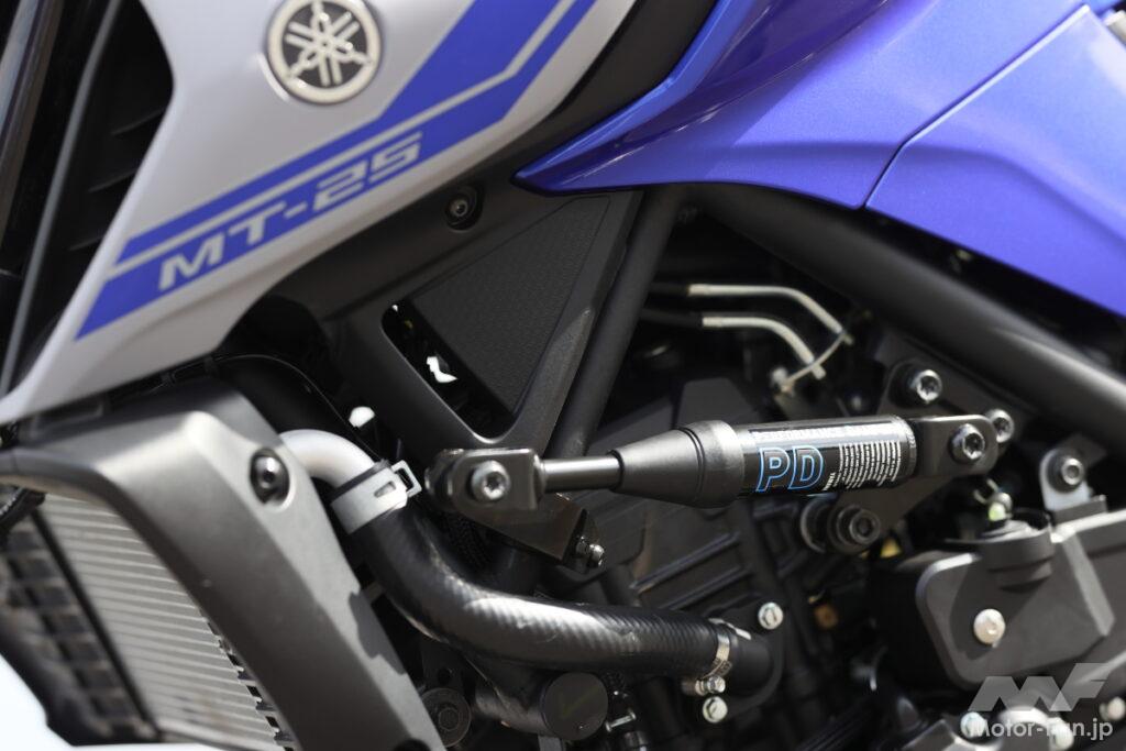 試乗車はヤマハのミドルクラスネイキッドのMT-25で、パフォーマンスダンパー装着車と非装着車が用意された。