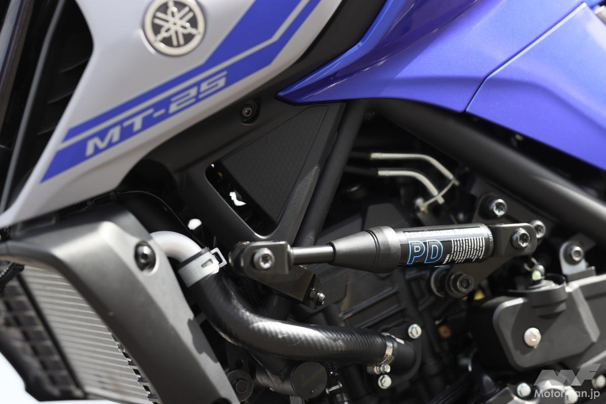 試乗車はヤマハのミドルクラスネイキッドのMT-25で、パフォーマンスダンパー装着車と非装着車が用意された。
