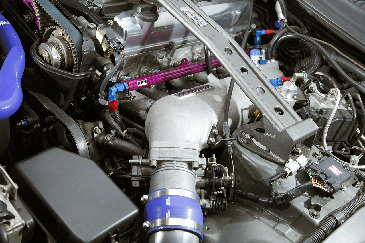 腰下はJUNの87φピストンとI断面コンロッドを組んで3.1Lまでスケールアップ。ヘッドにはポート加工を施した上で、HKSのハイカム(IN264度8.6mm EX280度9.3mm)を投入。マネージメントはF-CON Vプロだ。