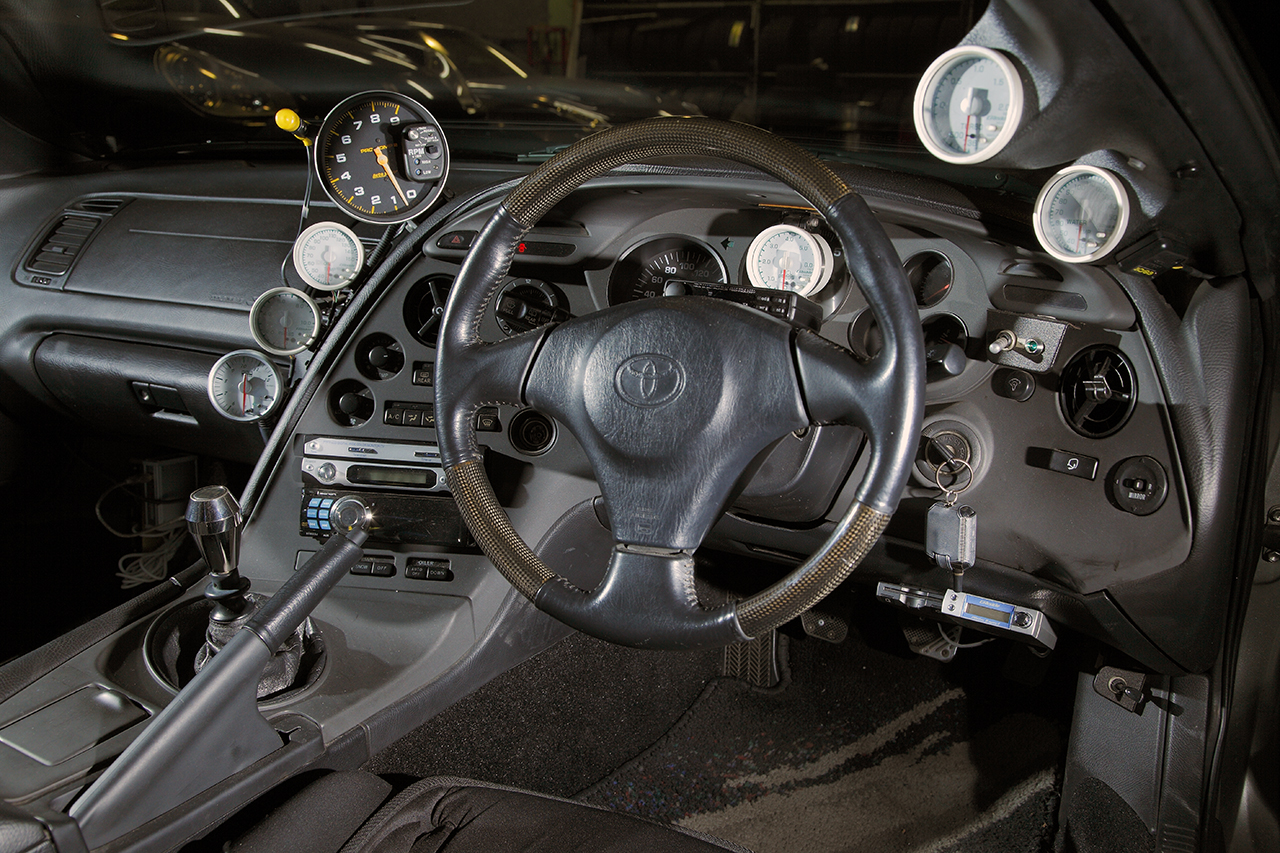 グレッディシリーズ&オートメーターPRO COMP2など、計7つの追加メーターがドライバーを取り囲むように配備された戦闘的なコクピット。なお、アタック時のシフトアップポイントは8400rpmであった。