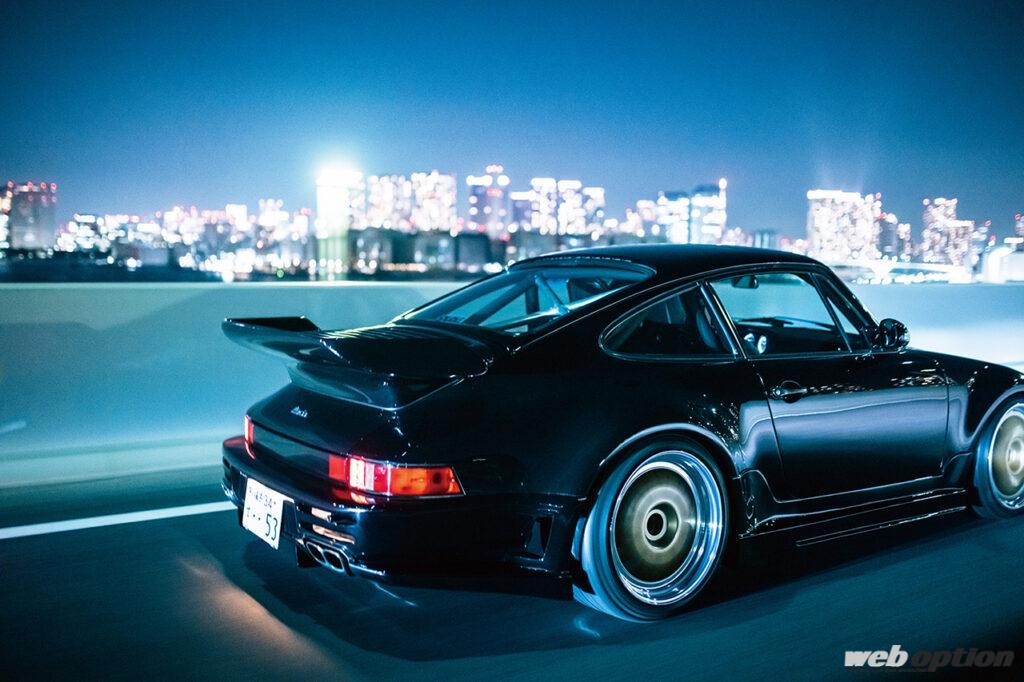 エンジンはオリジナルの3.3Lをベースに964ターボの純正タービン(KKKの27.2)に換装。純正とはいえ、ハウジング以外は全て手が入っており、モーテック制御で555psを絞り出す。知る人ぞ知る伝説のチューナーが湾岸仕様にセッティングを施した1台とのことだ。