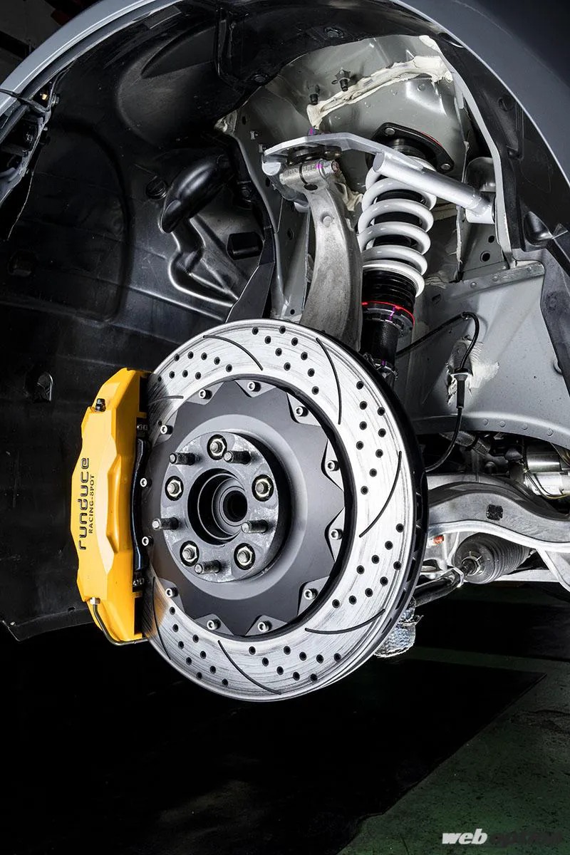 足回りは、快適性とハンドリングの頼もしさを両立するためにHKSのハイパーマックスRでセットアップ。 サスペンションのアーム類は、遊びのないソリッドなピロボールタイプに変更済みだ。一方のブレーキは、重量級ボディを安心して制御するため、オリジナルの鍛造キャリパーキットを投入する。