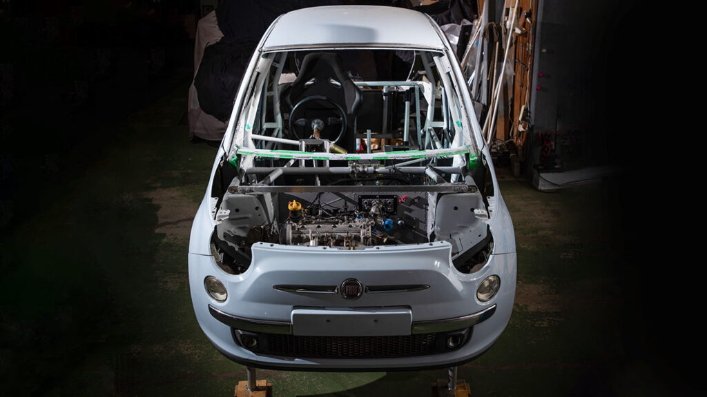 レースパックのデジタルダッシュをマウントした10点式ロールケージは、お手製のフレームに直接溶接されている。計算されたパーツレイアウトには舌を巻くばかりだ。