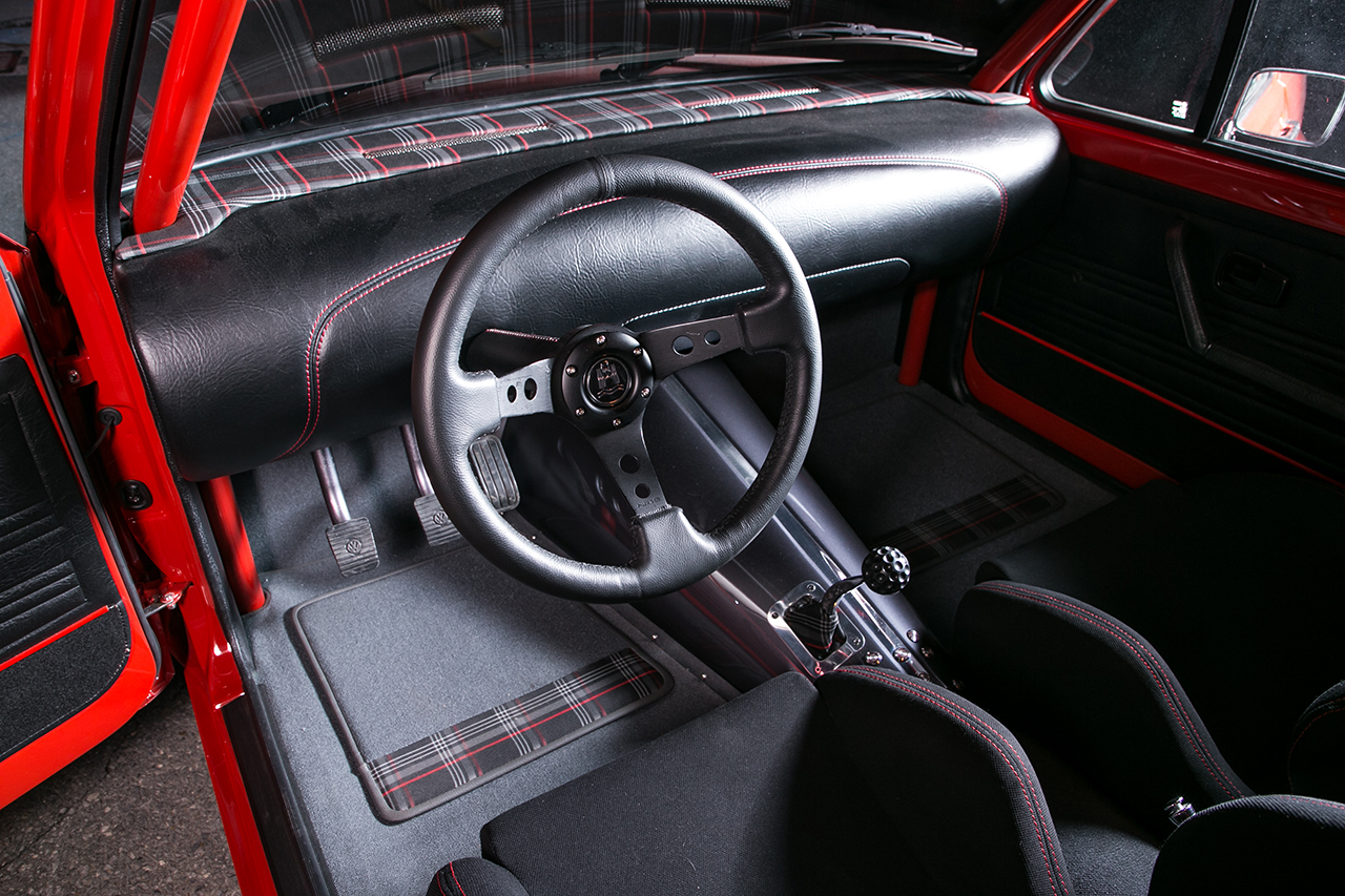 そんな超美麗なエクステリアに負けじと、インテリアもFRP製のダッシュボードにレザーを貼ったフルカスタムメイド仕様となる。ゴルフ7のGTIに使用されているチェック柄のトリムが随所に取り入れられているのも面白い。
