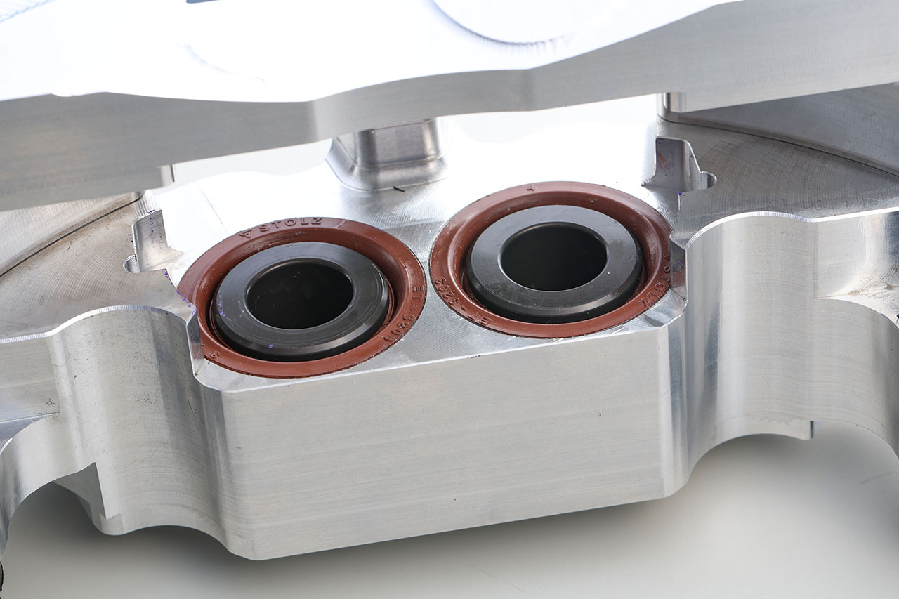 注目すべきキャリパー本体は、鋳造ではなく1500tプレスによる鍛造素材を採用した本格派。ピストンはダストブーツ付きの2ポッド仕様で、純正シングルに比べて120〜130%の押圧面積を誇る。