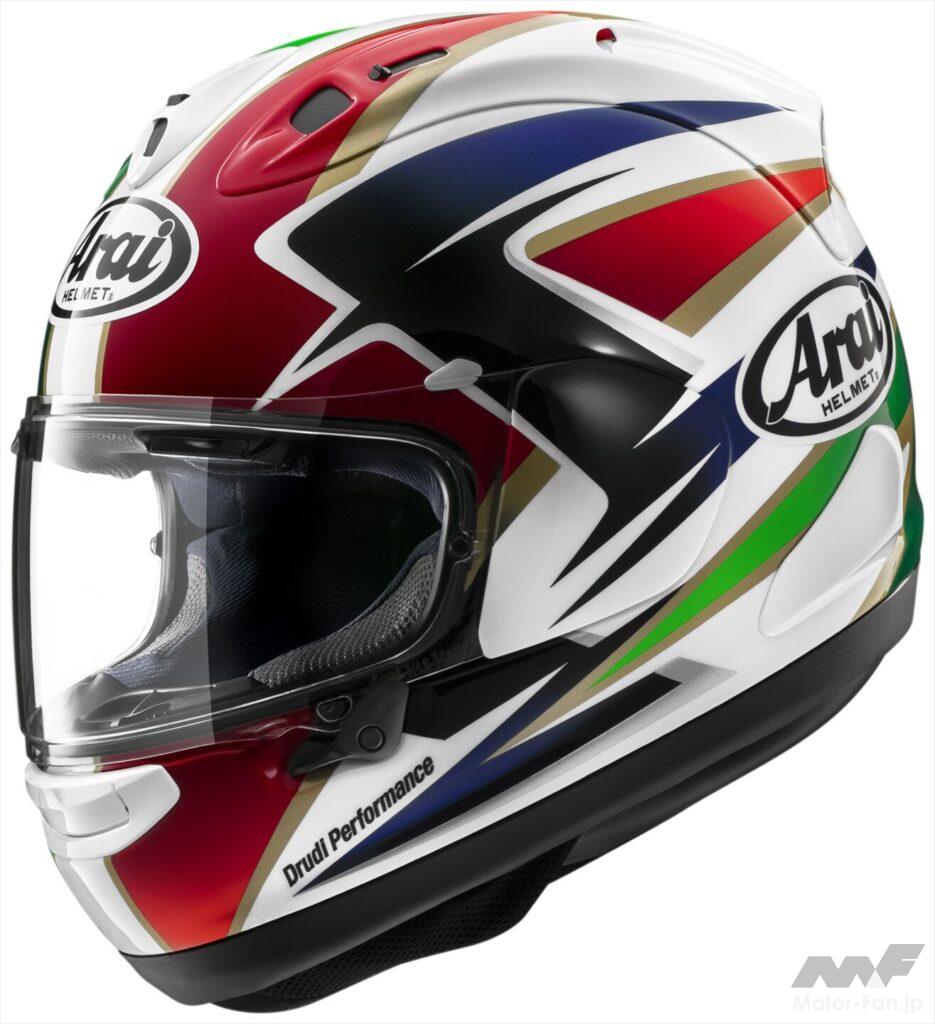 125ccから500ccまで、すべてのクラスで勝利を挙げ、安定感と勝負強さをもつ、クールでいぶし銀な走りが魅力だったカダローラ。母国イタリアをイメージしたカラフルでシャープなデザインは、過去アライからレプリカモデルが販売されていたのは、往年のベテランならご存じのはず。今回の復刻モデルでも、その特徴ある外観はしっかりと受け継がれている。懐かしいブラッシュデザインは、Z900RSのような走りを意識したレトロスポーツモデルのほか、スポーツツアラーに合わせても似合うだろう。