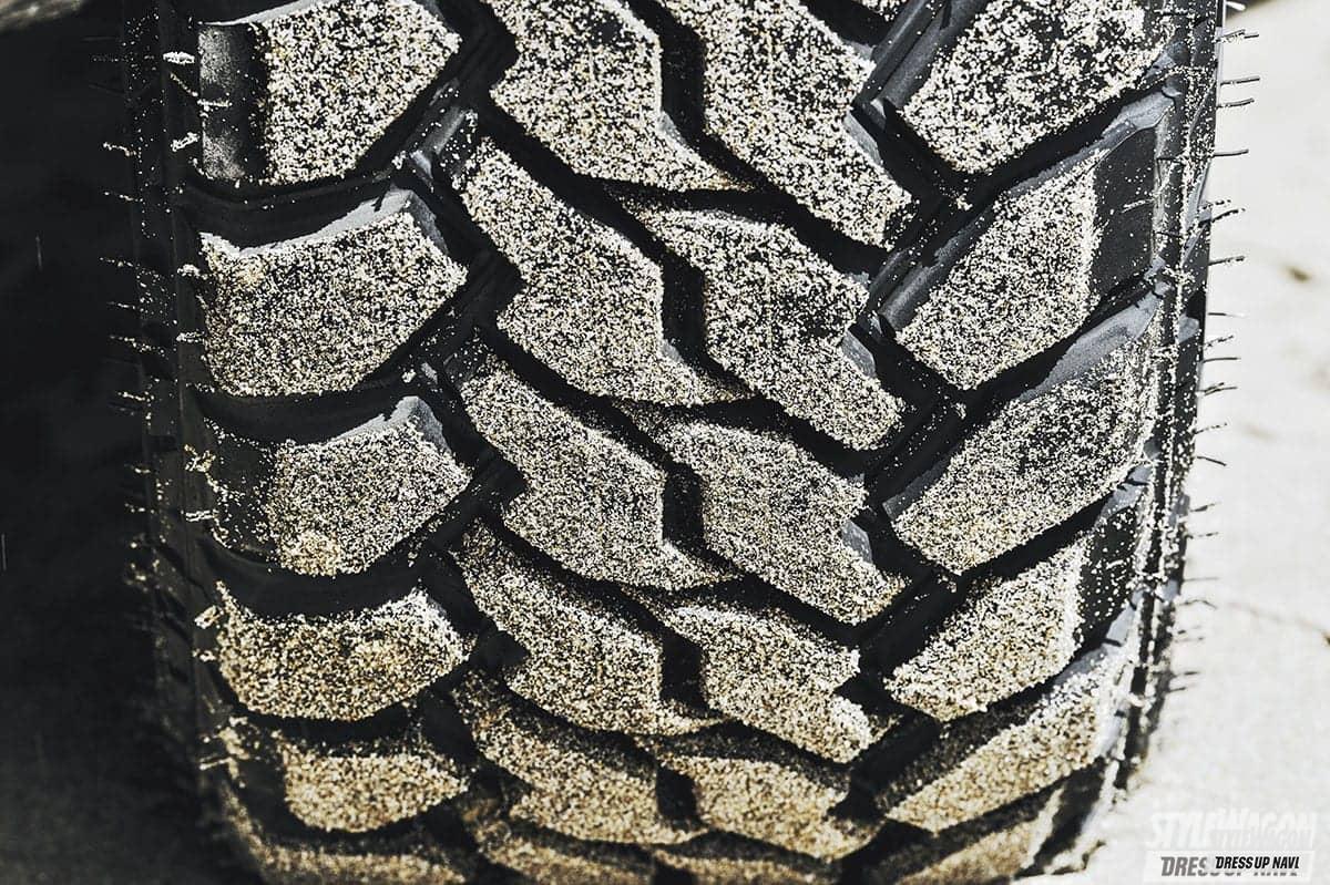 ショルダー部にまで刻み込まれた意匠が、オフロードムードを盛り上げる。サイドウォールに入ったホワイトレターも太めでキュート。ドレスアップ効果も抜群だ。