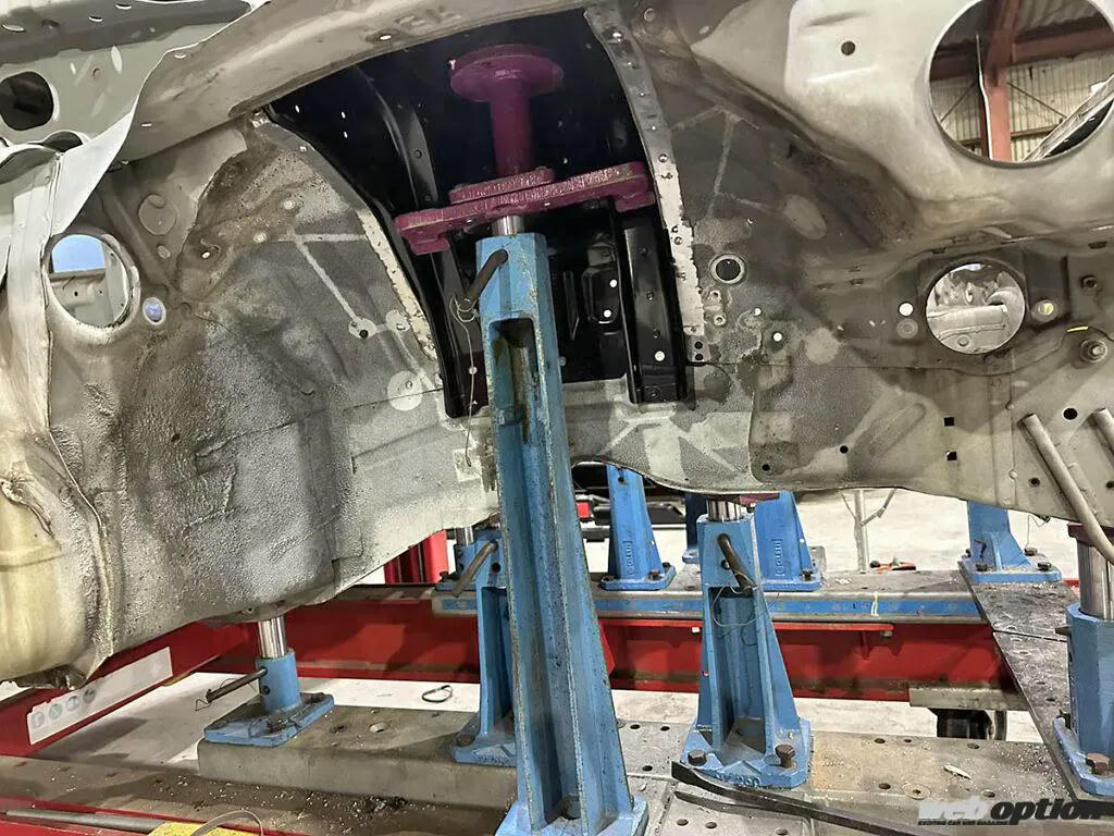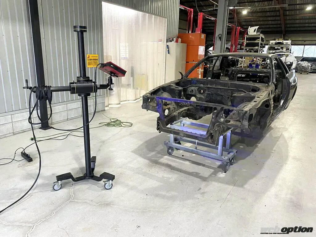 ボディパネル交換時は正確な位置出しが重要だ。ガレージヨシダでは、車両組み立て工場と同じ治具を用意して位置出しした後に、オリジナルのストラットタワーキットやカウルトップブレースをスポット溶接していく。