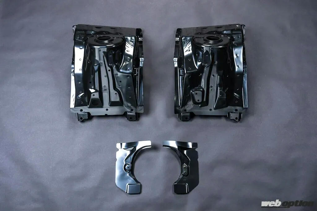 オリジナルのストラットタワーキットは、厳格な強度検査などをクリアした現行車両にも使用されている自動車用鋼板を採用。溶接前のパネルをパッケージングしたキットだけでなく、自動車パネル製造業者が高出力スポット溶接で組み上げて電着塗装した完成キットも用意する。
