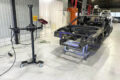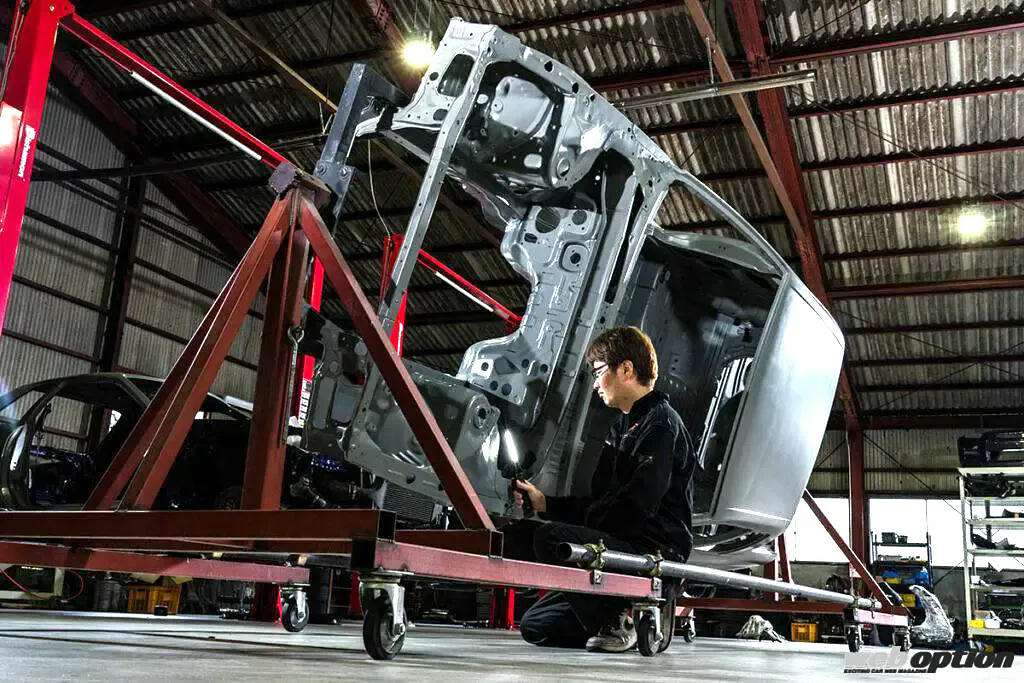 ボディパネル交換時は正確な位置出しが重要だ。ガレージヨシダでは、車両組み立て工場と同じ治具を用意して位置出しした後に、オリジナルのストラットタワーキットやカウルトップブレースをスポット溶接していく。