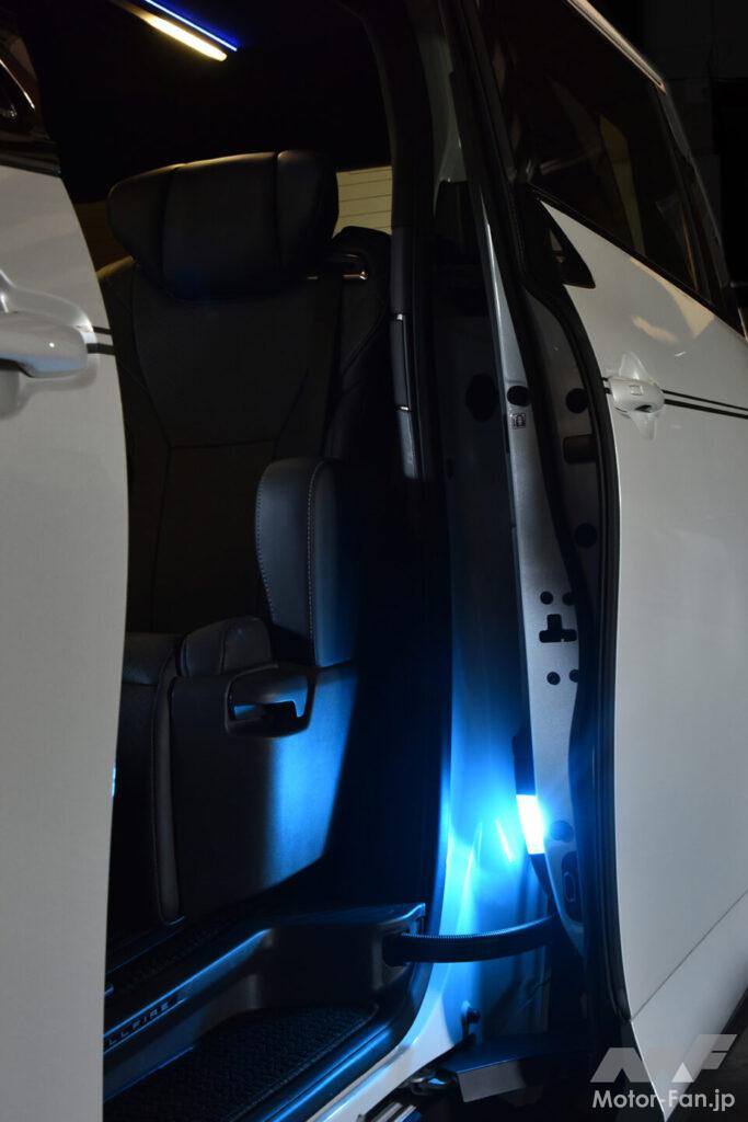 40系アルヴェルには純正でスライドドア部分にステップ照明が装備されているが、光源も小さく明るさもイマイチ。シルクブレイズセレクトアイテムのスライドドアイルミネーションは、そんな純正ステップ照明に比べ、明るさも照射範囲も大幅に向上。夜間や暗い場所はもちろん、日中でも存在感のあるライティングを実現。どんなシーンでも視認性を高め、安全な乗降をサポートしてくれる。また、発光カラーはホワイトとブルーの2色に切り替えが可能で、無段階での光量調整機能も採用と、機能面も申し分なし。最上級ミニバンに相応しい、鮮明な光と優れた実用性が手に入るのだ。価格や詳細はまだ未定とのことだが、いまから発売が待ち遠しい限りだ。