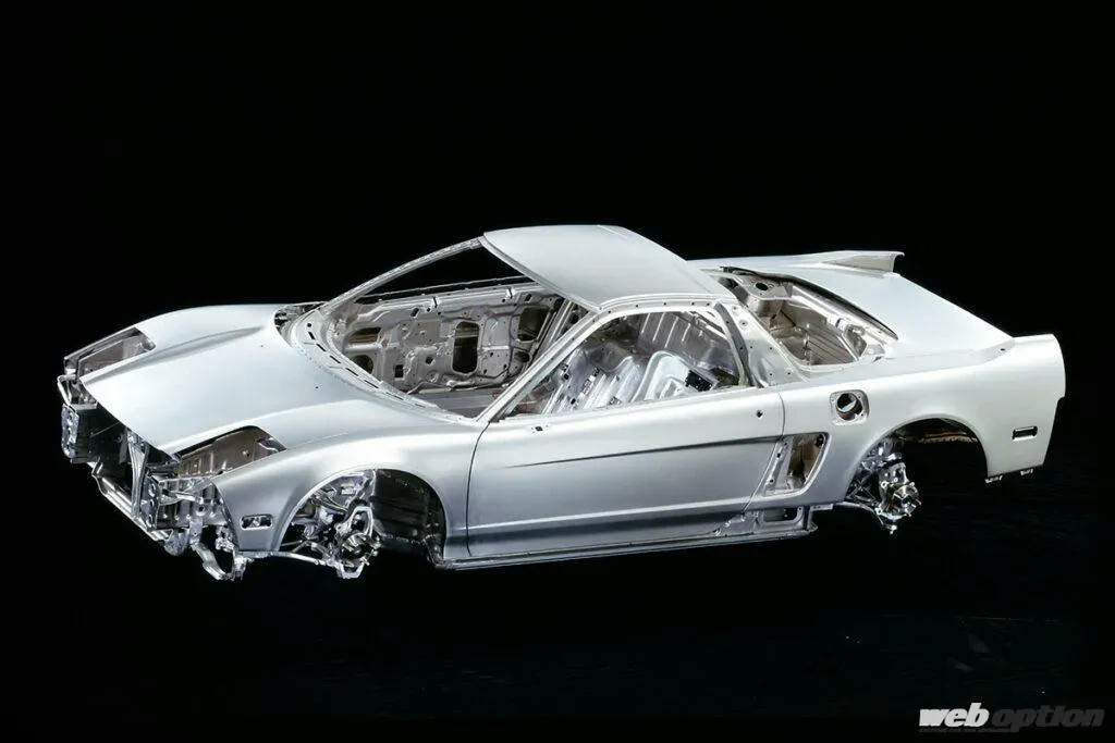 従来のモノコックボディは、スチール系の鋼板で作られていた。それを、世界初となる軽量&高剛性のオールアルミ製として製作、採用したのがホンダのフラッグシップスポーツ「NSX」だ。ボディパネルだけでなく、構造部材までもがアルミ製。フルストリップのボディ重量は210kgと、鋼板ボディと比べて約140kgもの軽量化に成功している。