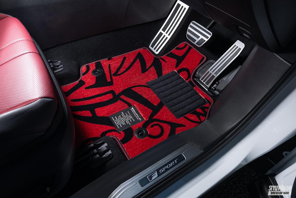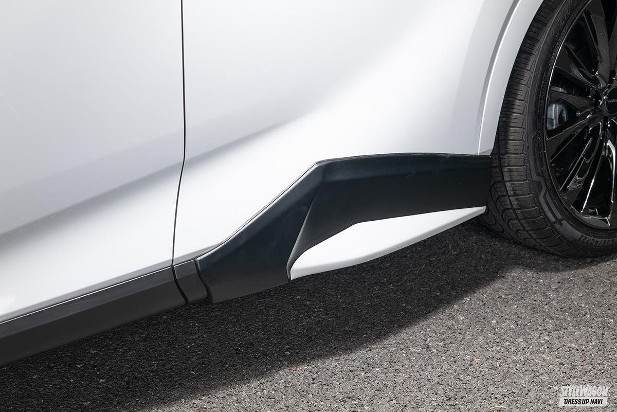 今回、RXに用意されたボディキットは、前後サイドの3点。少ない手数でも、確実にスタイルアップが図れるプログラムとなっている。フロントとリアはハーフタイプで、縦フィンやダクがあしらわれたエッジの効いた造形は、デモカーのような塗り分けも効果的。ベース車が持つ高級感を底上げしつつ、さらにスポーティなスタイルを演出可能だ。また、サイドは、リアドアのみに装着するパネルを設定。中央部を跳ね上げたようなデザインは、疾走感あふれるサイドビューを生み出してくれる。