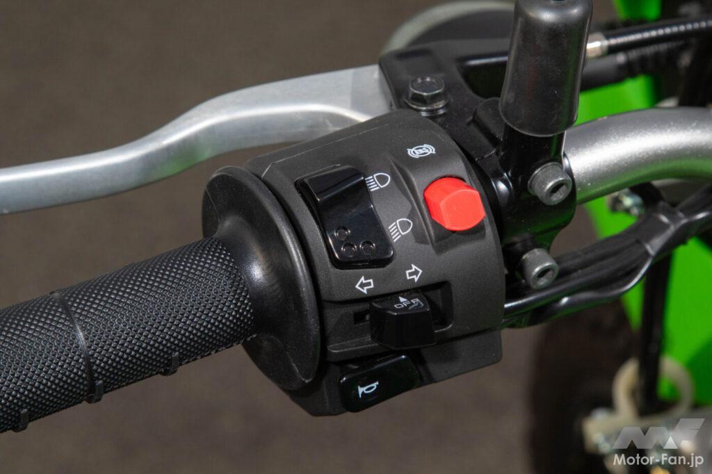 ブリッヂ付きパイプバーのアップハンドルを採用。先代モデルより左右グリップ位置は高く前方寄りにセットされた。ハンドルスイッチはシンプル。オーソドックスなレイアウトで扱いやすい。右のスイッチは赤いエンジンキルスイッチと黒いセルスタータースイッチ。