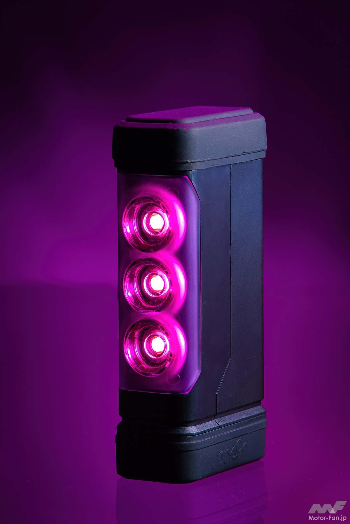 「本製品は新規設計LEDを採用しています。一般的に、紫の光の波長は視認範囲が狭いことにより、電気をそのまま色に変えても人の目には見えづらいという問題がありました。その辺りも蛍光体の配合とかを変えて補完しています。レンズもいろんな色で染めてみて、それぞれの組み合わせごとに明るさを測ったり、実際にフィールドで確認もしています(高橋氏)」