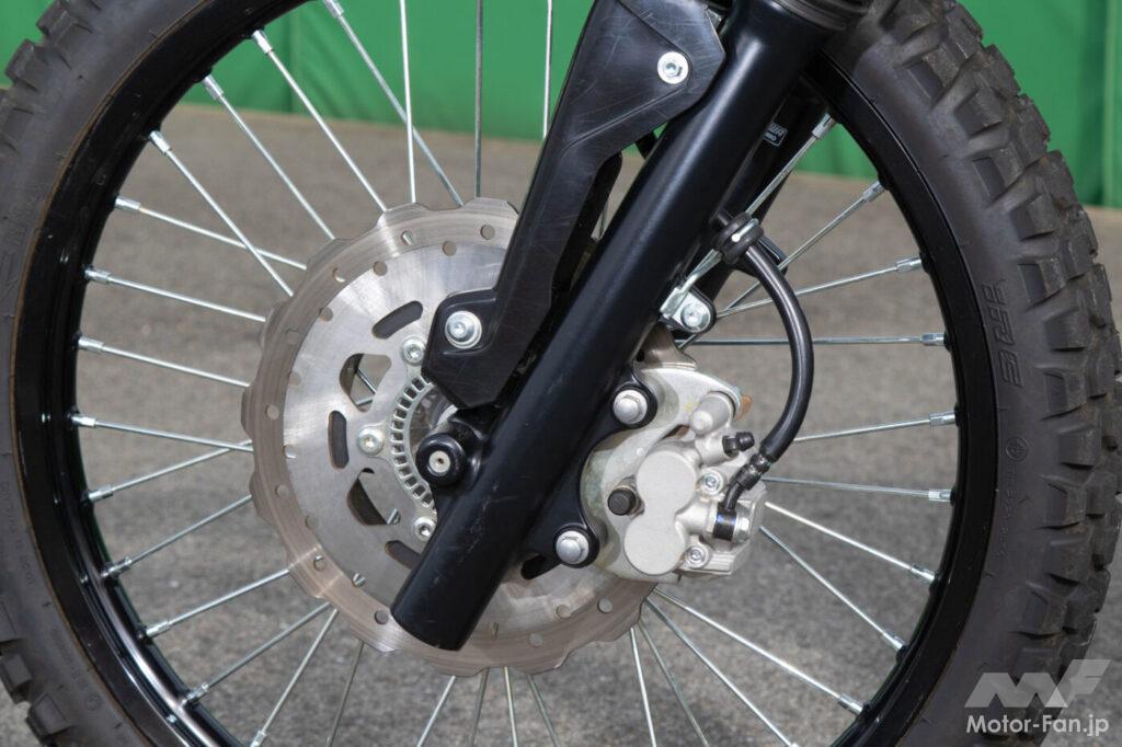 200mmのストロークを誇るφ37mmのフロントフォークはリーディングアクスル式。ブレーキはφ265mmのペタルディスクにデュアルピストンのピンスライド式油圧キャリパーを装備。